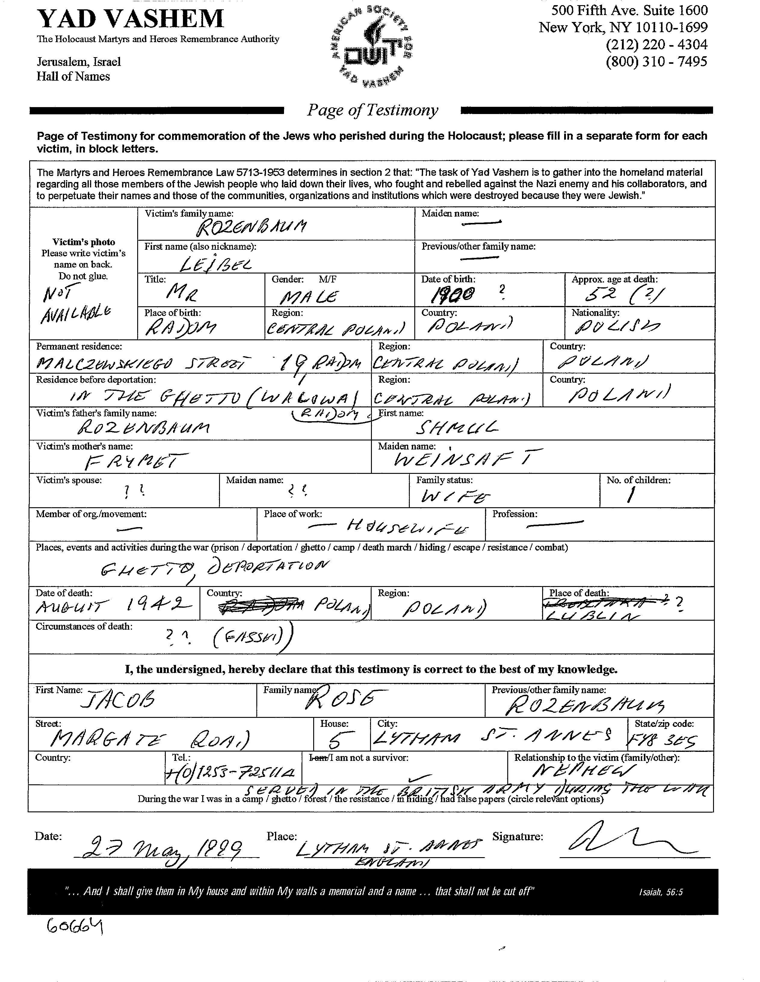 Розенбаум Лейбел 1900 Радом, Польша Лист свидетельских показаний