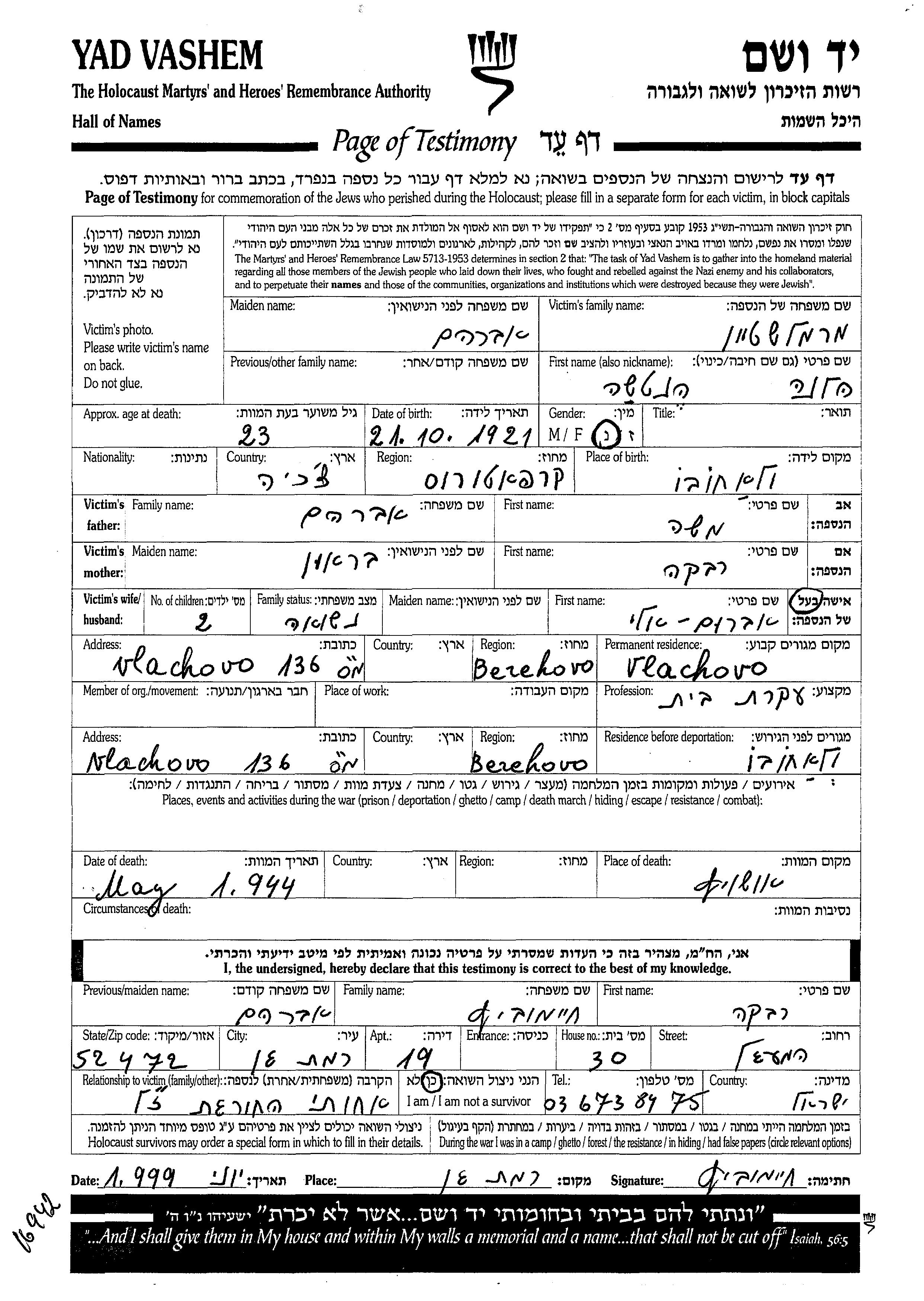 Мермельштейн Хелена Хенча 1921 Влахово, Чехословакия Лист свидетельских показаний