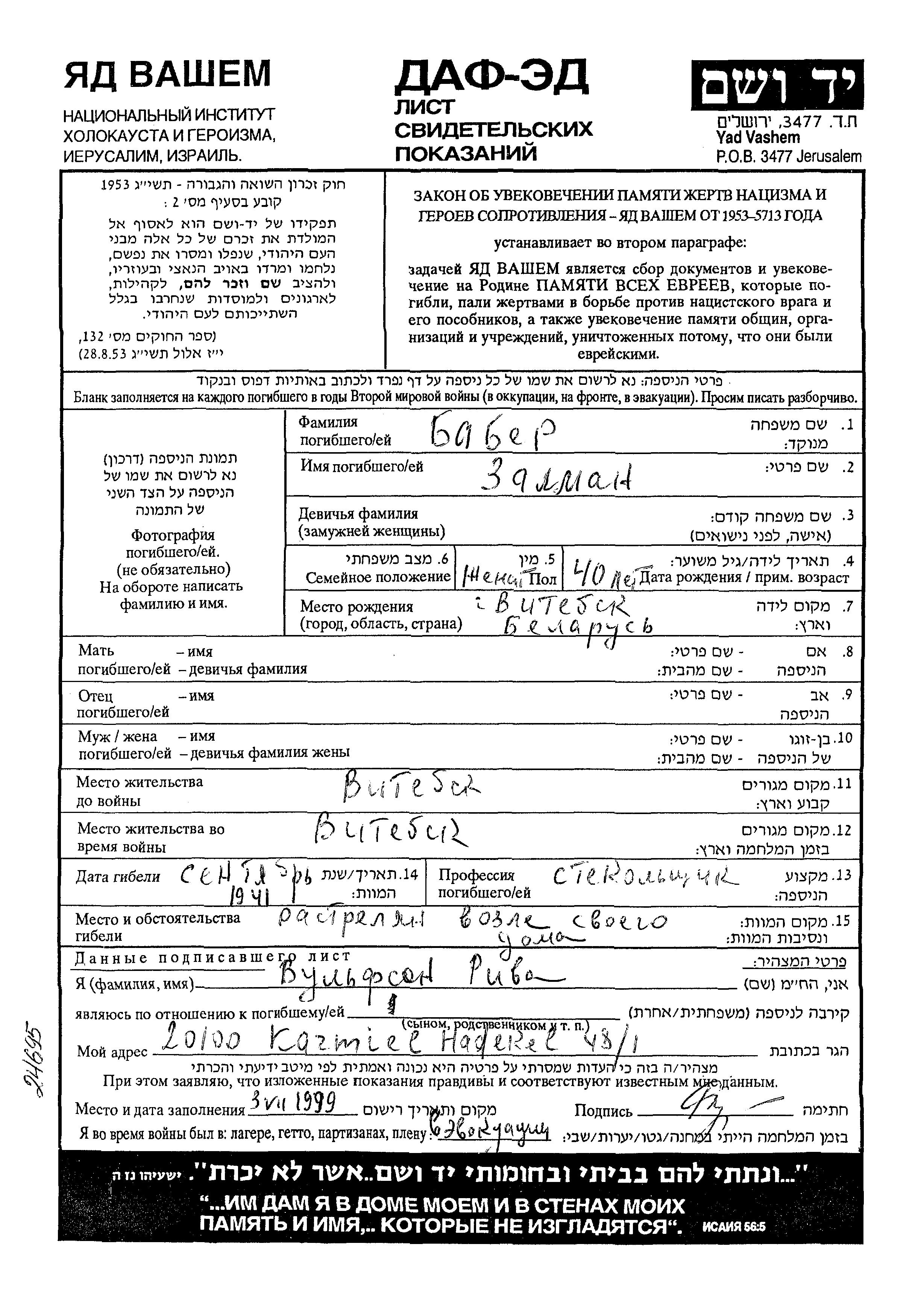 Бабер Залман Витебск, Белоруссия (СССР) Лист свидетельских показаний