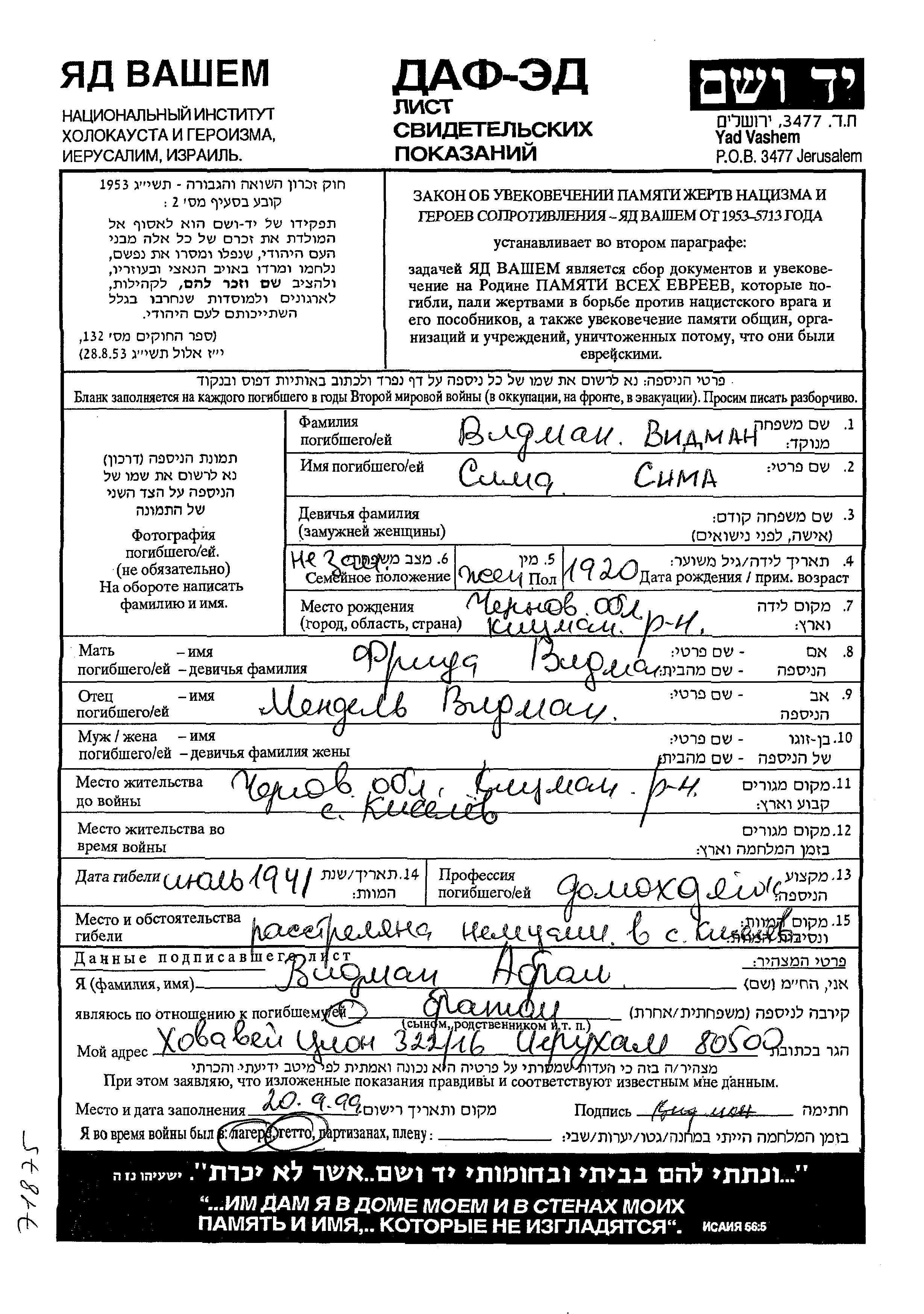 Сима Видман, место рождения: Черновцы, Румыния. Отец: Мендель, mать:Фрида. Домохозяйка. Место жительства до войны: Киселев, Румыния. Место во время войны: Киселев, Румыния.