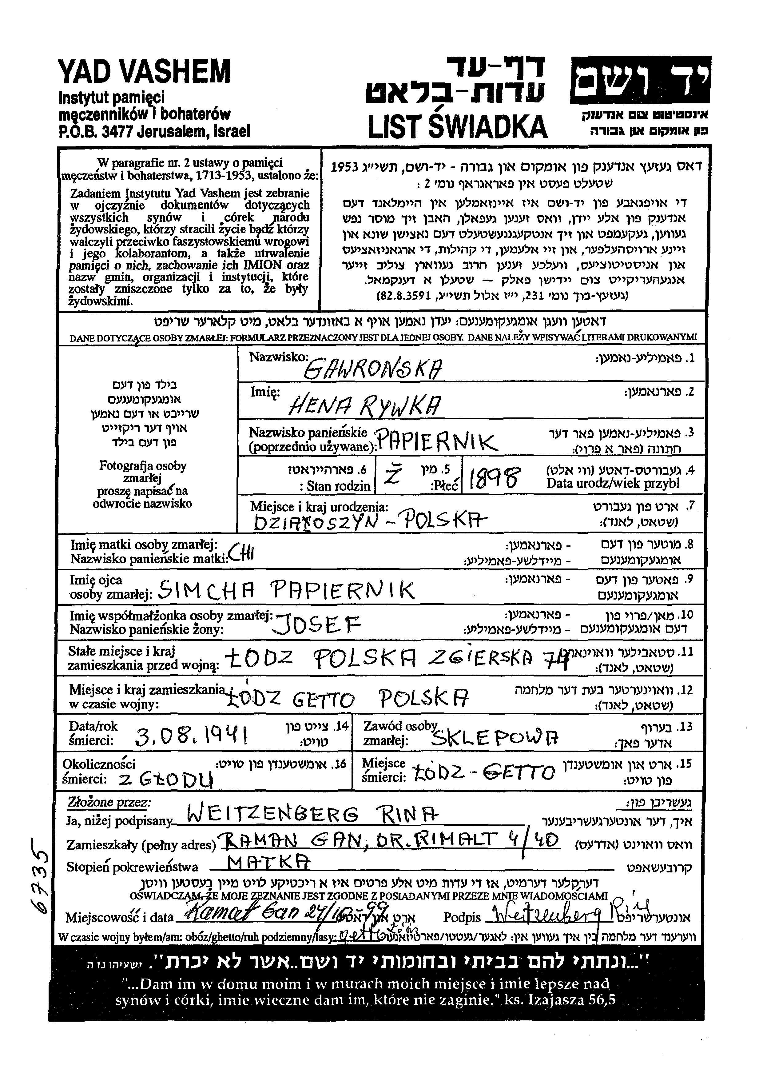 Хена Рывка Гавронска, девичья фамилия Паперник, место рождения: Дзялошин, Польша. Отец: Симха. Владелец / владелица магазина. Женат / замужем. Место жительства до войны: Лодзь, Польша. Место во время войны: Лодзь, Польша.