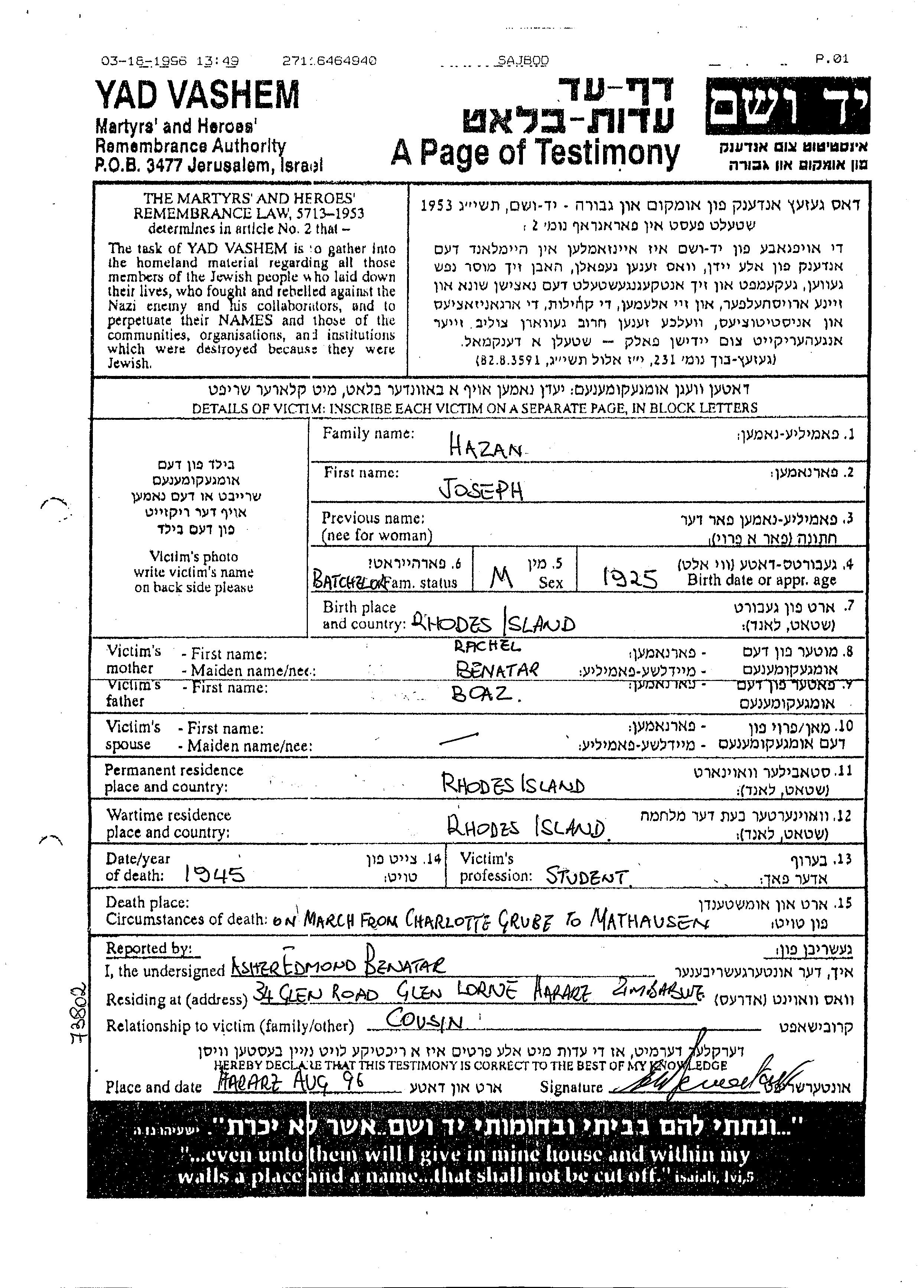 Йосеф Хазан, место рождения: Родос, Италия. Отец: Боаз, mать:Рахель. Студент / студентка. Холост / не замужем. Место жительства до войны: Родос, Италия. Место во время войны: Charlottengrube, Польша.