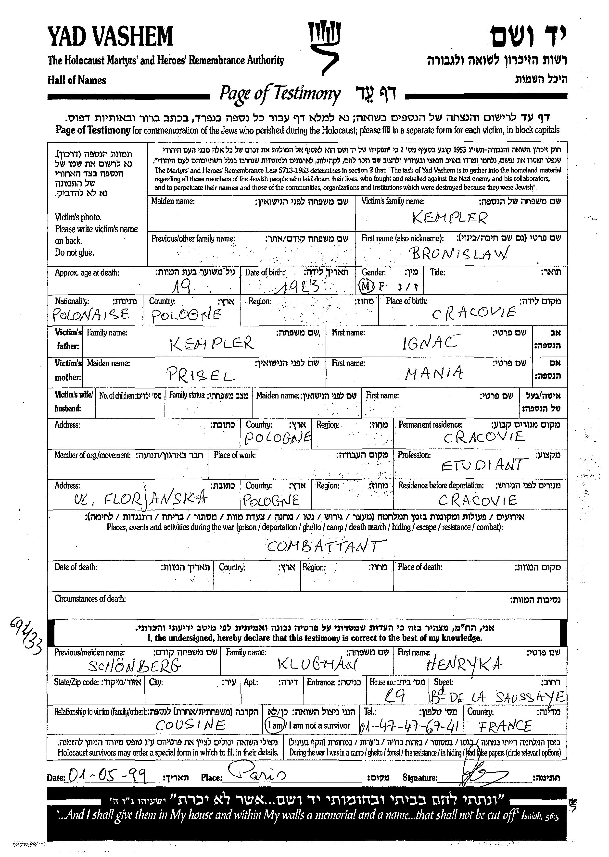 Бронислав Кемплер, место рождения: Краков, Польша. Отец: Игнац, mать:Маня. Студент / студентка. Место жительства до войны: Краков, Польша. Место во время войны: Краков, Польша.