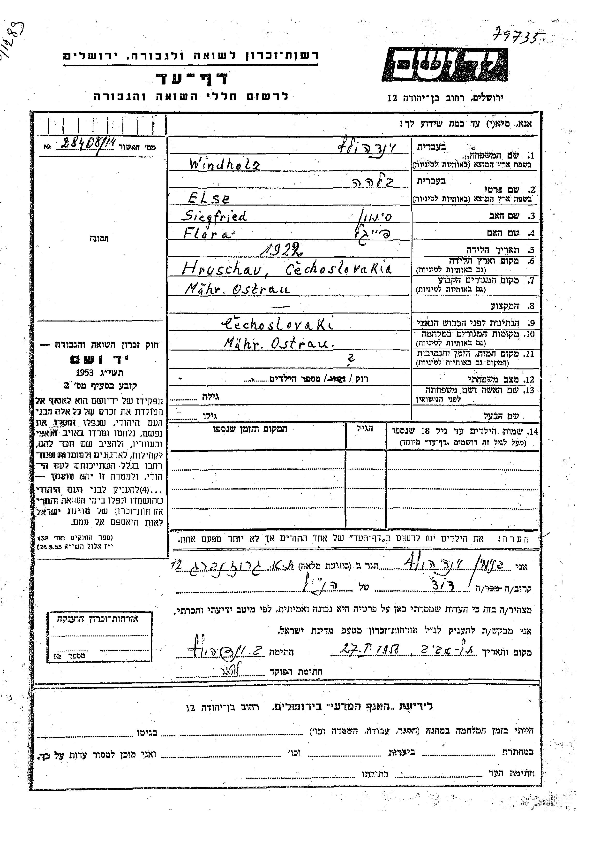 Виндхольц Эльзе Бильха 1922 Мериш-Острау, Чехословакия Лист свидетельских показаний