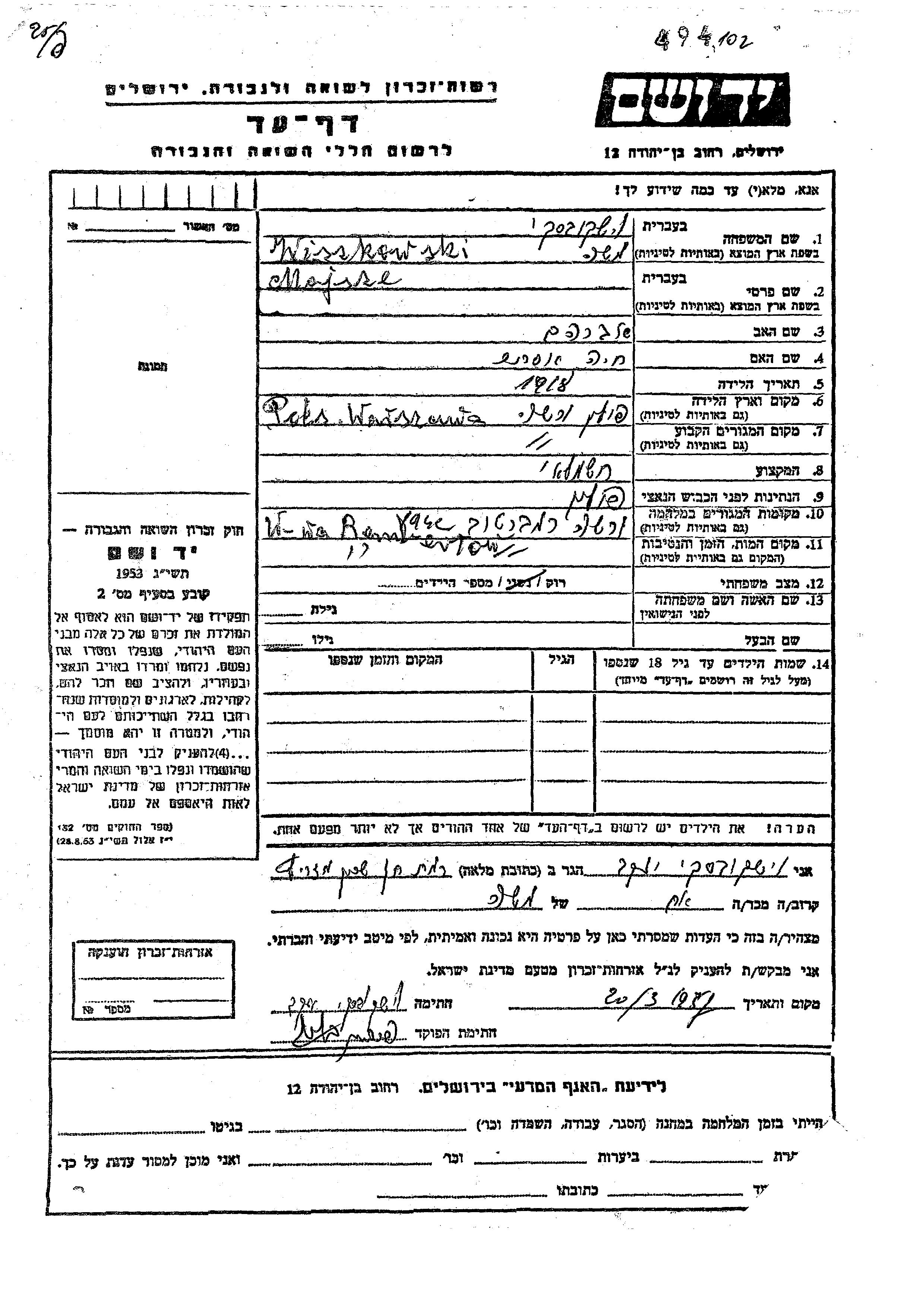 Мойше Вишковски, место рождения: Варшава, Польша. Отец: Авраам, mать:Хая Эстер. Электрик. Холост / не замужем. Место жительства до войны: Варшава, Польша. Место во время войны: Варшава, Польша.