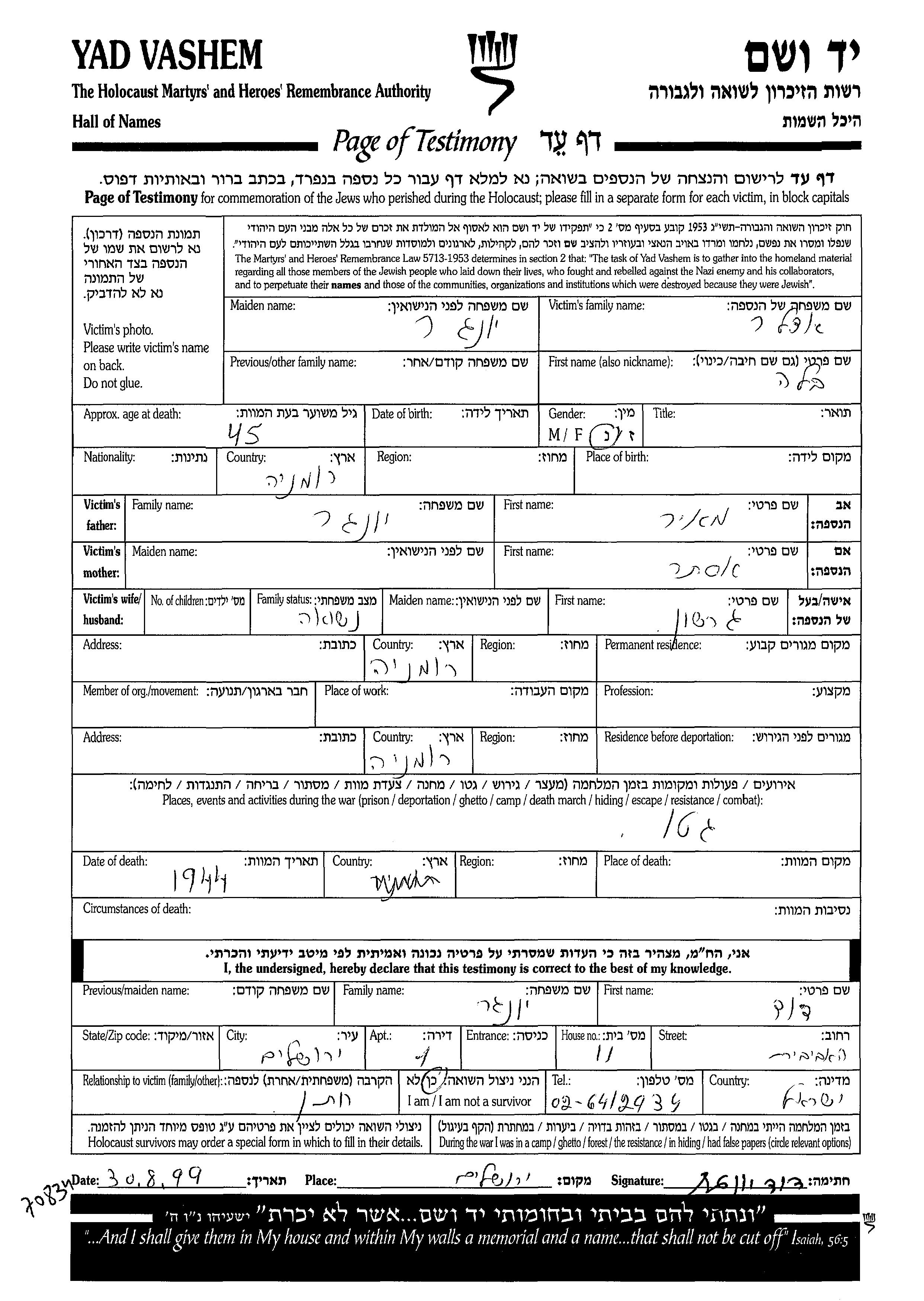 Яд Вашем - Листы свидетельских показаний Мемориального фонда