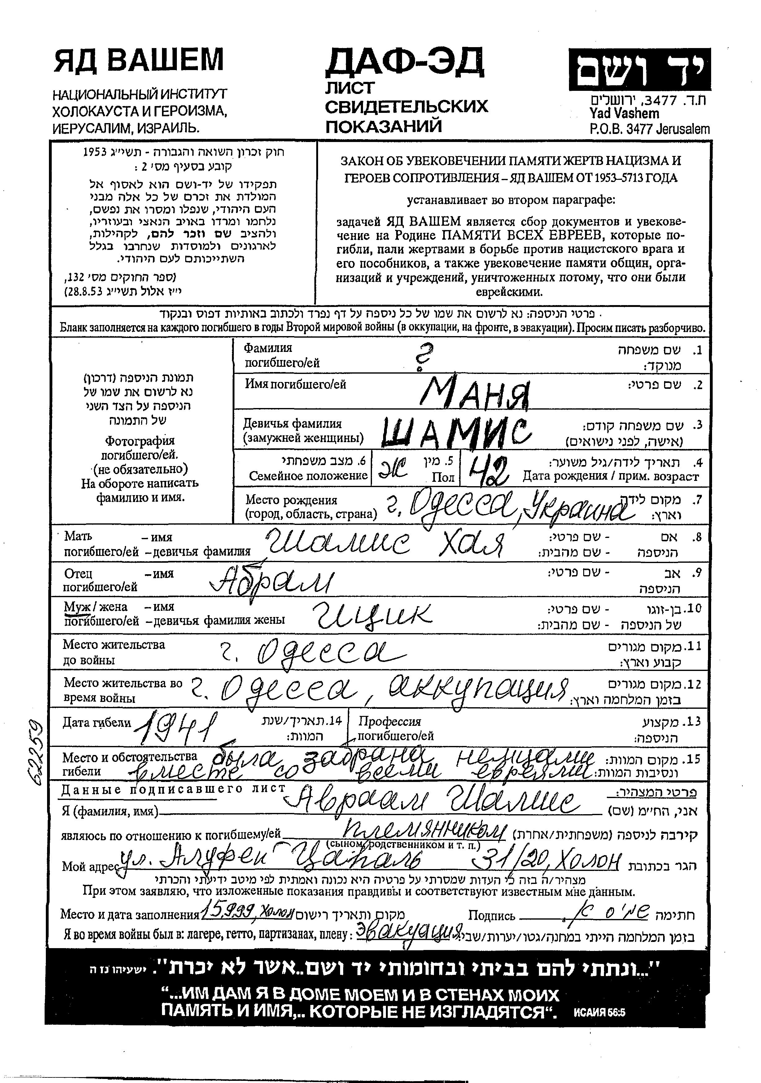 Яд Вашем - Листы свидетельских показаний Мемориального фонда