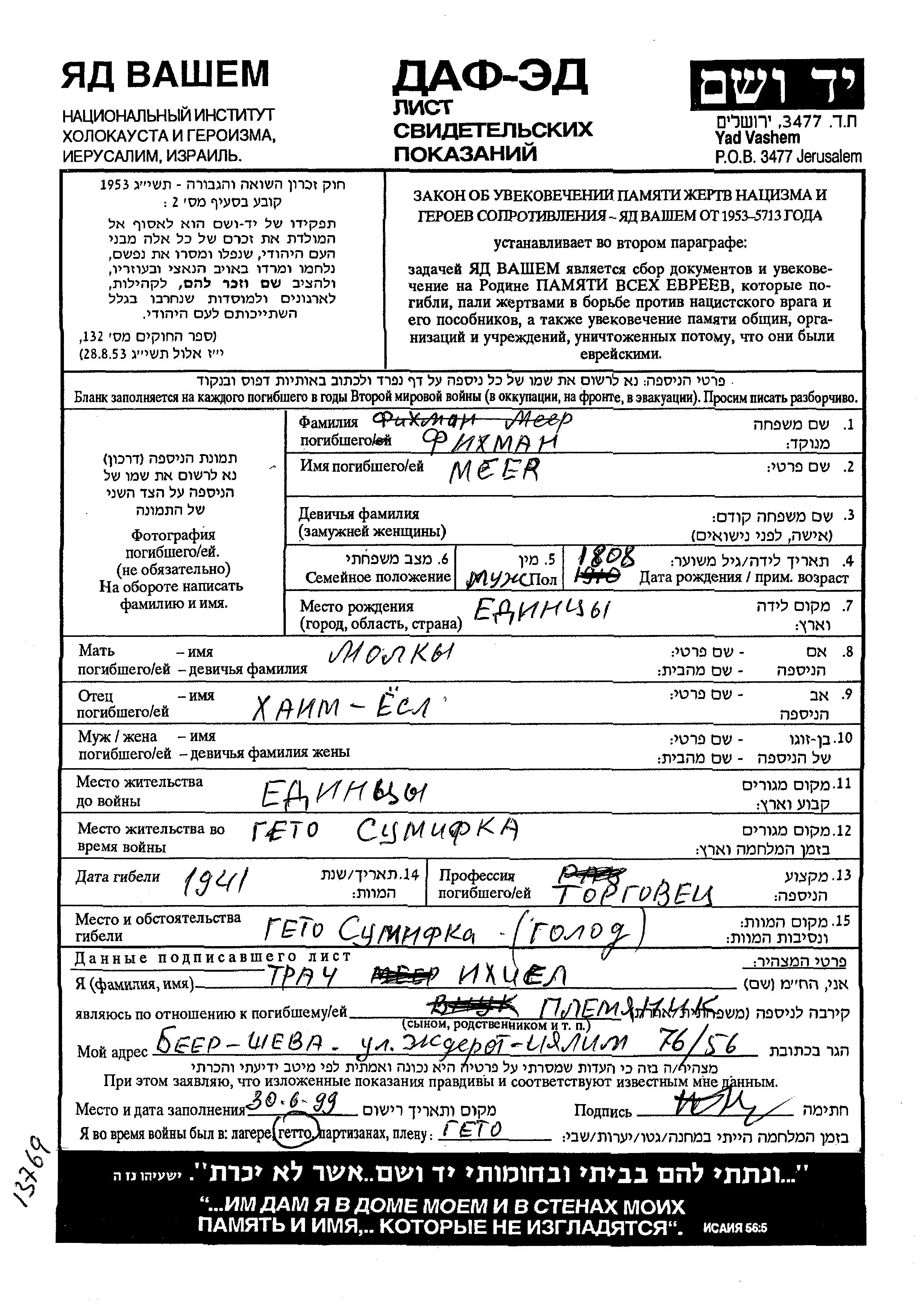 Яд Вашем - Листы свидетельских показаний Мемориального фонда