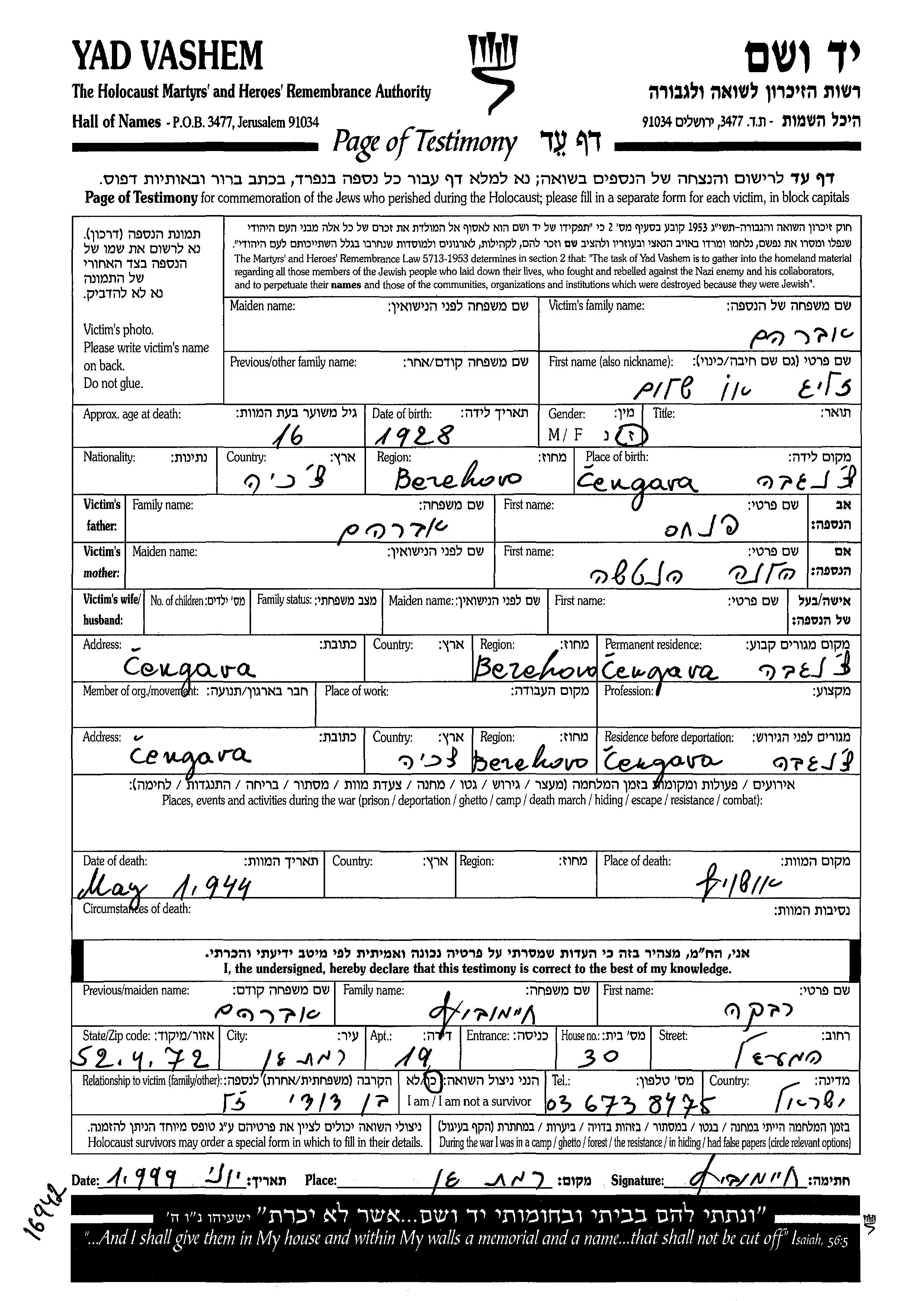 Яд Вашем - Листы свидетельских показаний Мемориального фонда