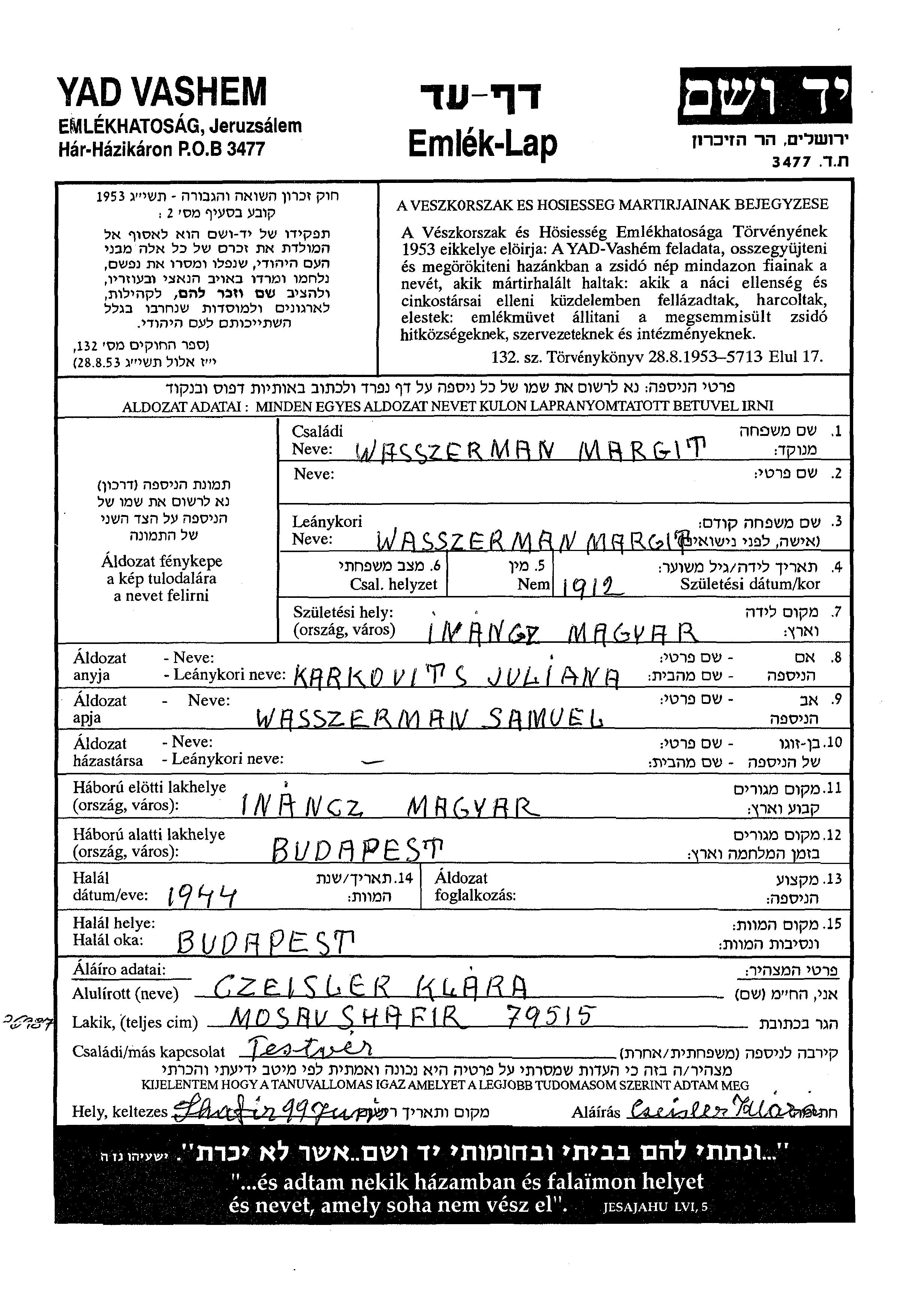 Маргит Вассерман, место рождения: Инанч, Венгрия. Отец: Самуэль, mать:Юлиана. Место жительства до войны: Инанч, Венгрия. Место во время войны: Будапешт, Венгрия.
