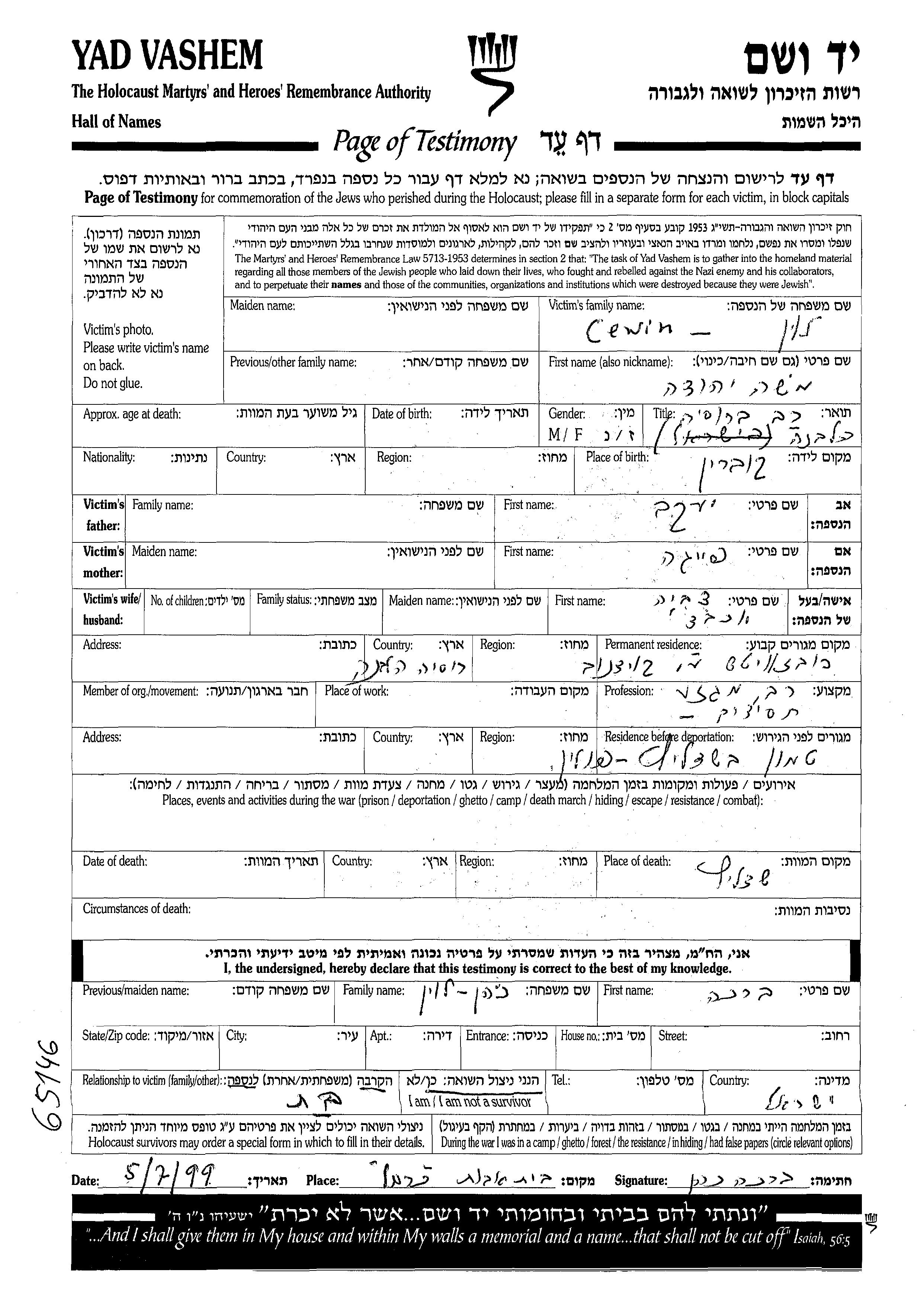 Яд Вашем - Листы свидетельских показаний Мемориального фонда