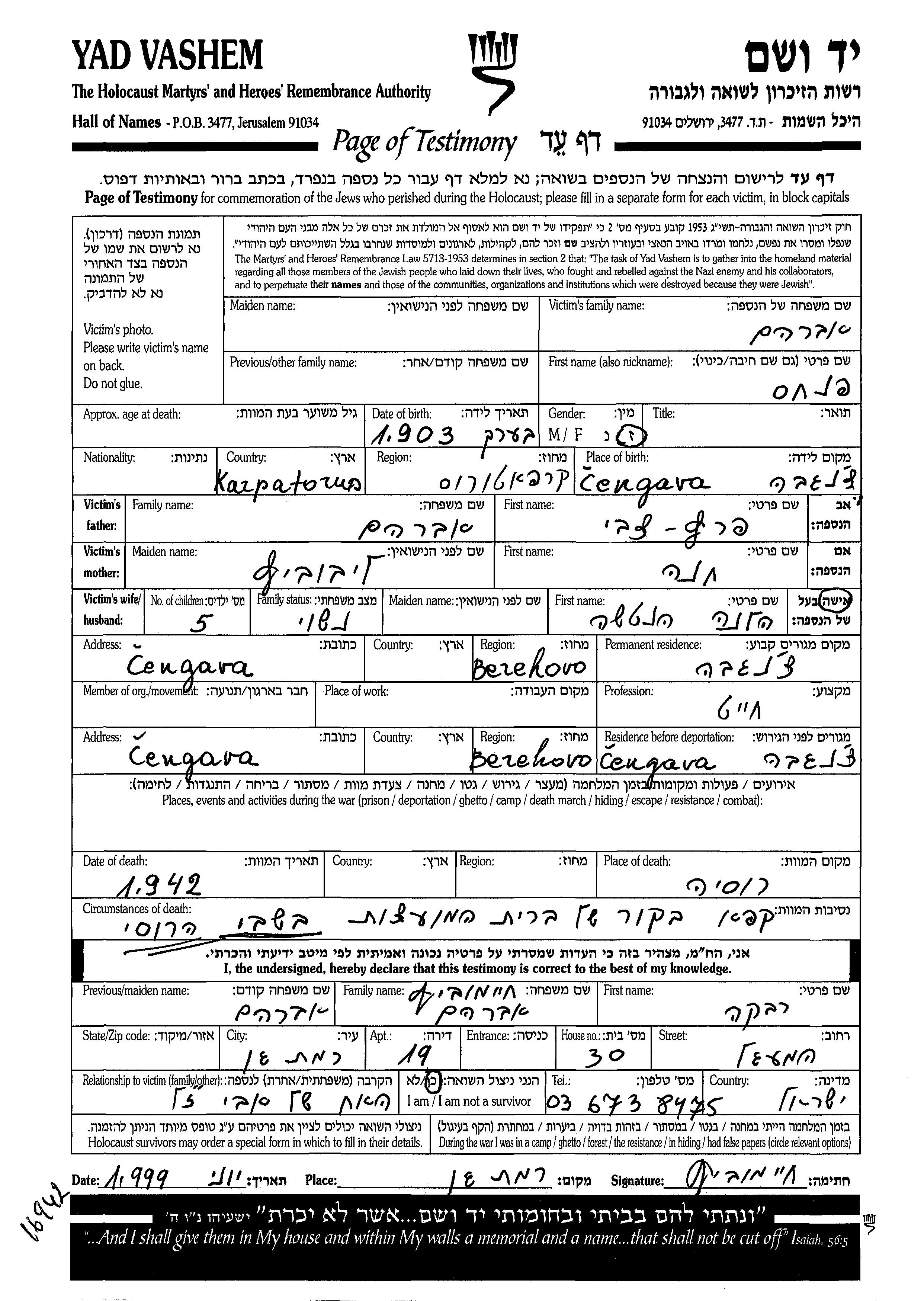 Авраам Пинхас 1903 Ченгава, Чехословакия Лист свидетельских показаний