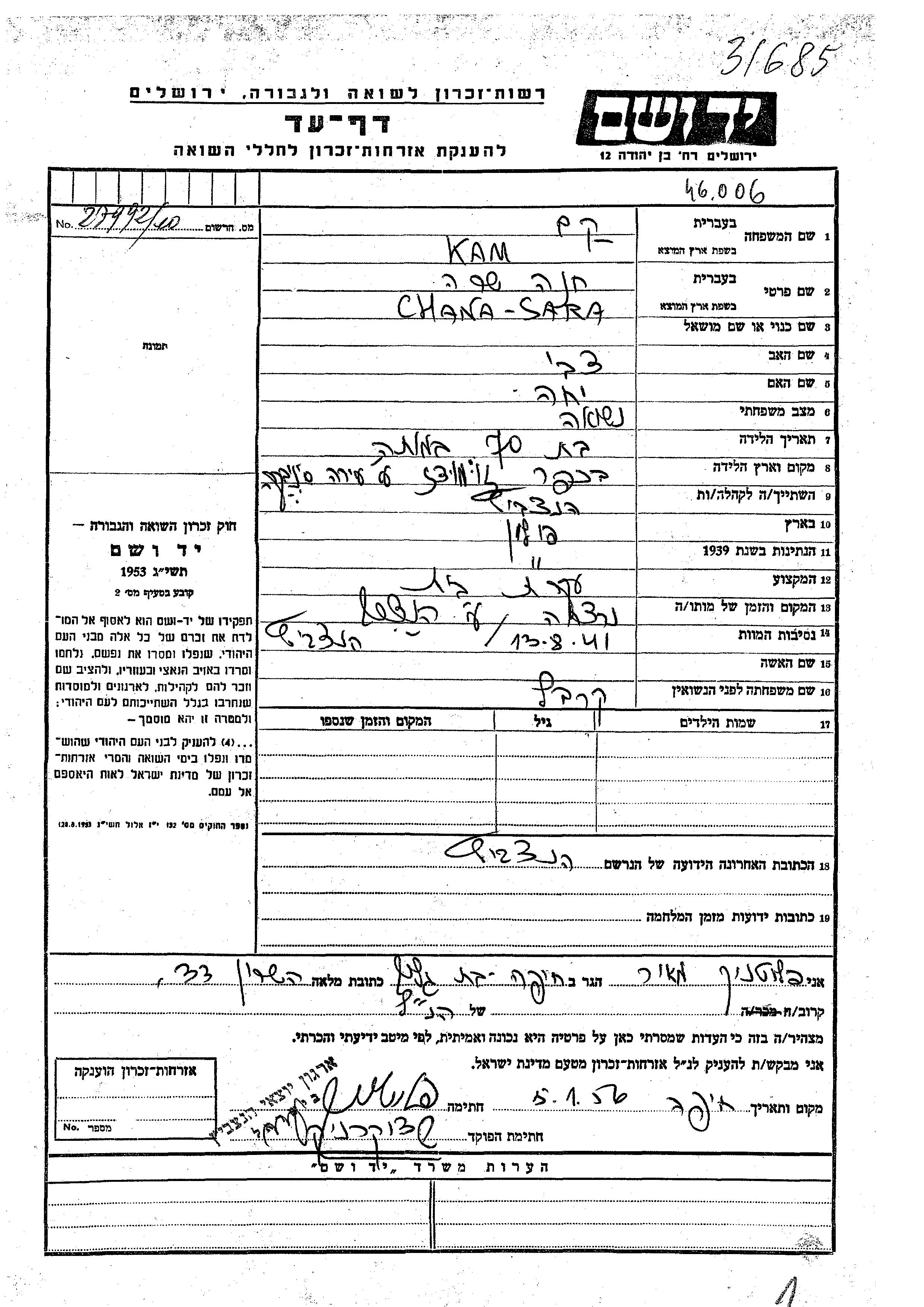 Хана Сара Кам, девичья фамилия Кравец, место рождения: Замосць, Польша. Отец: Цви, mать:Яха. Домохозяйка. Место жительства до войны: Ганцевичи, Польша. Место во время войны: Ганцевичи, Польша.