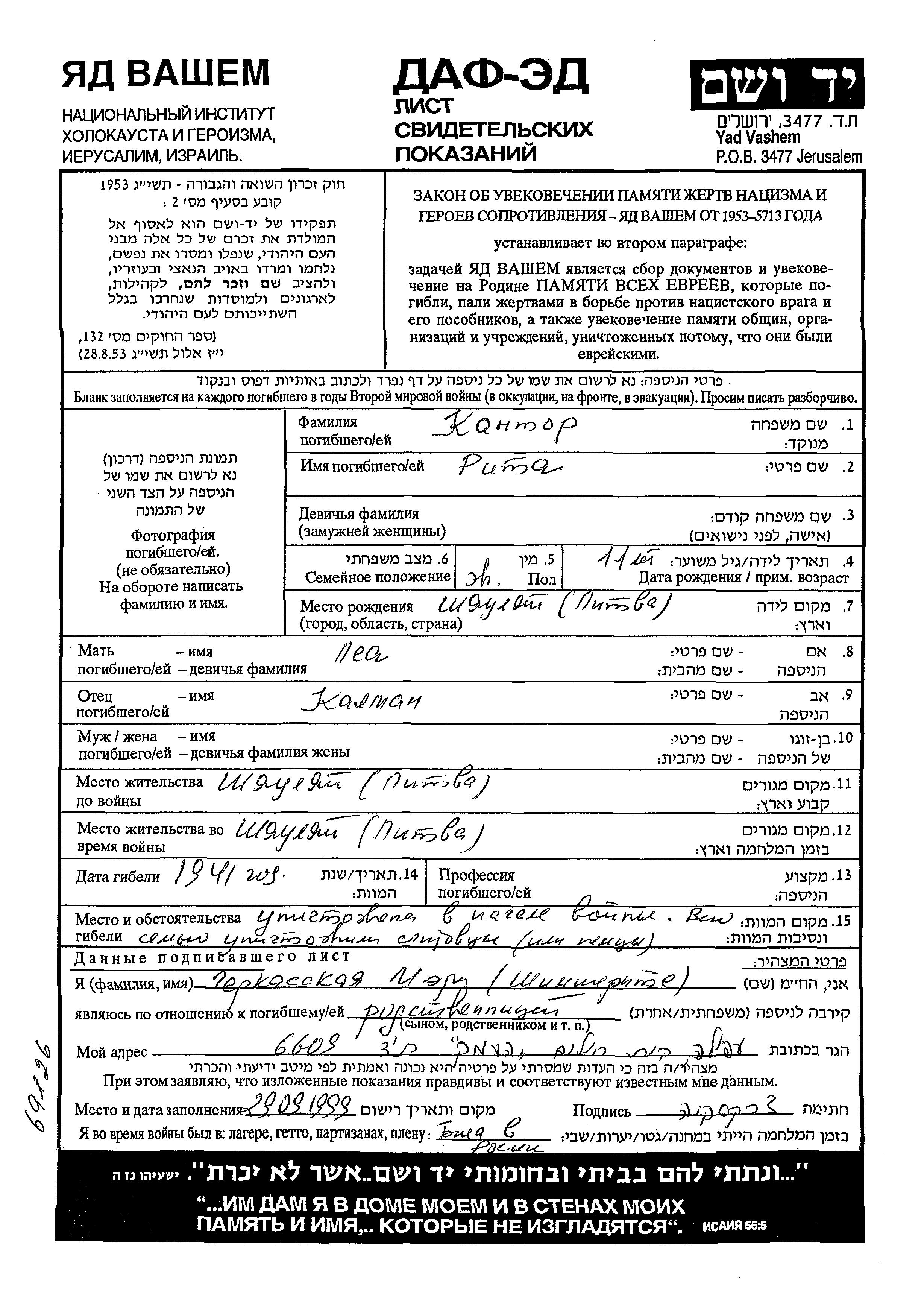 Яд Вашем - Листы свидетельских показаний Мемориального фонда