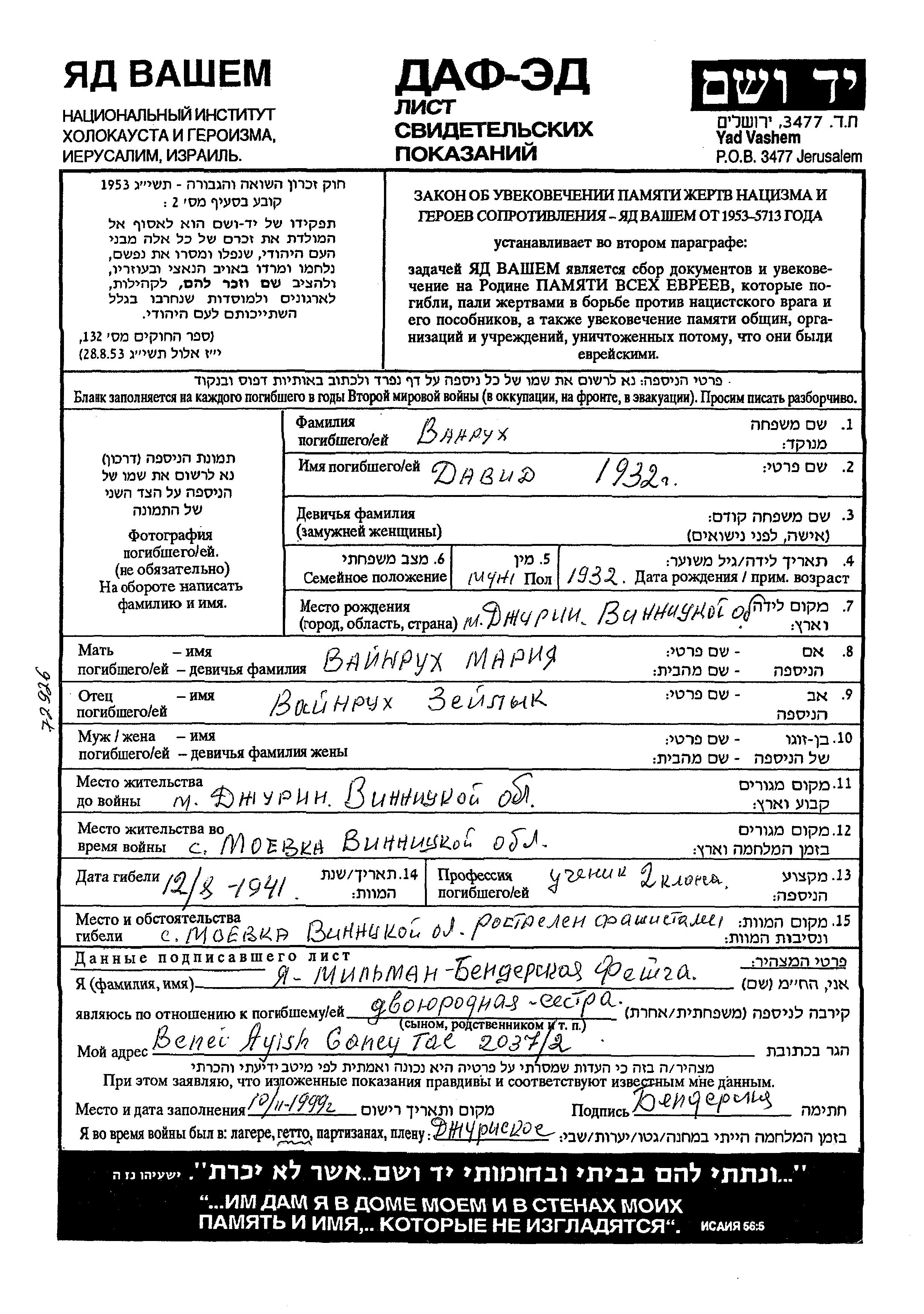 Вайнрух Давид 1932 Джурин, Украина (СССР) Лист свидетельских показаний