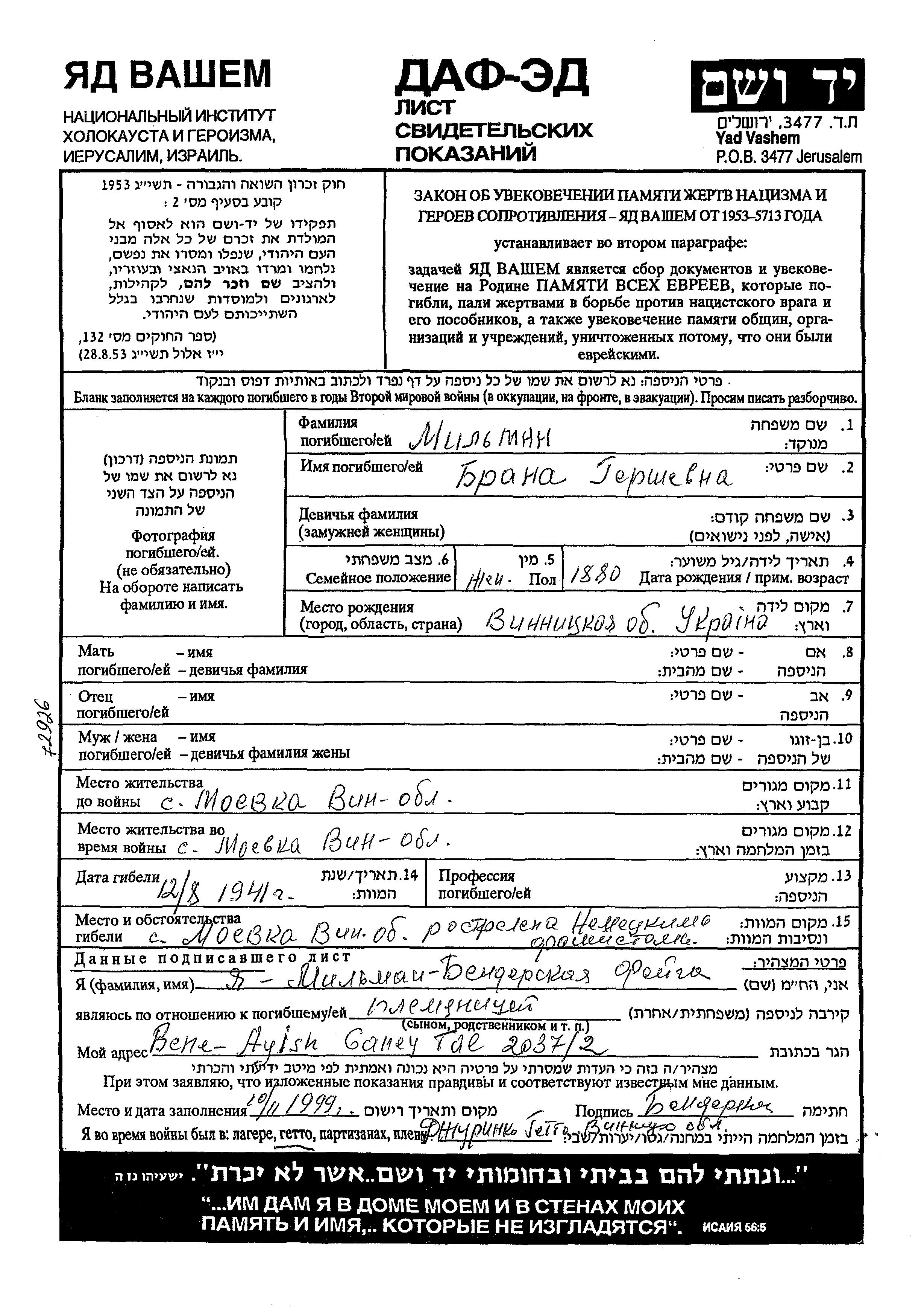 Мильман Брана 1880 Моевка, Украина (СССР) Лист свидетельских показаний
