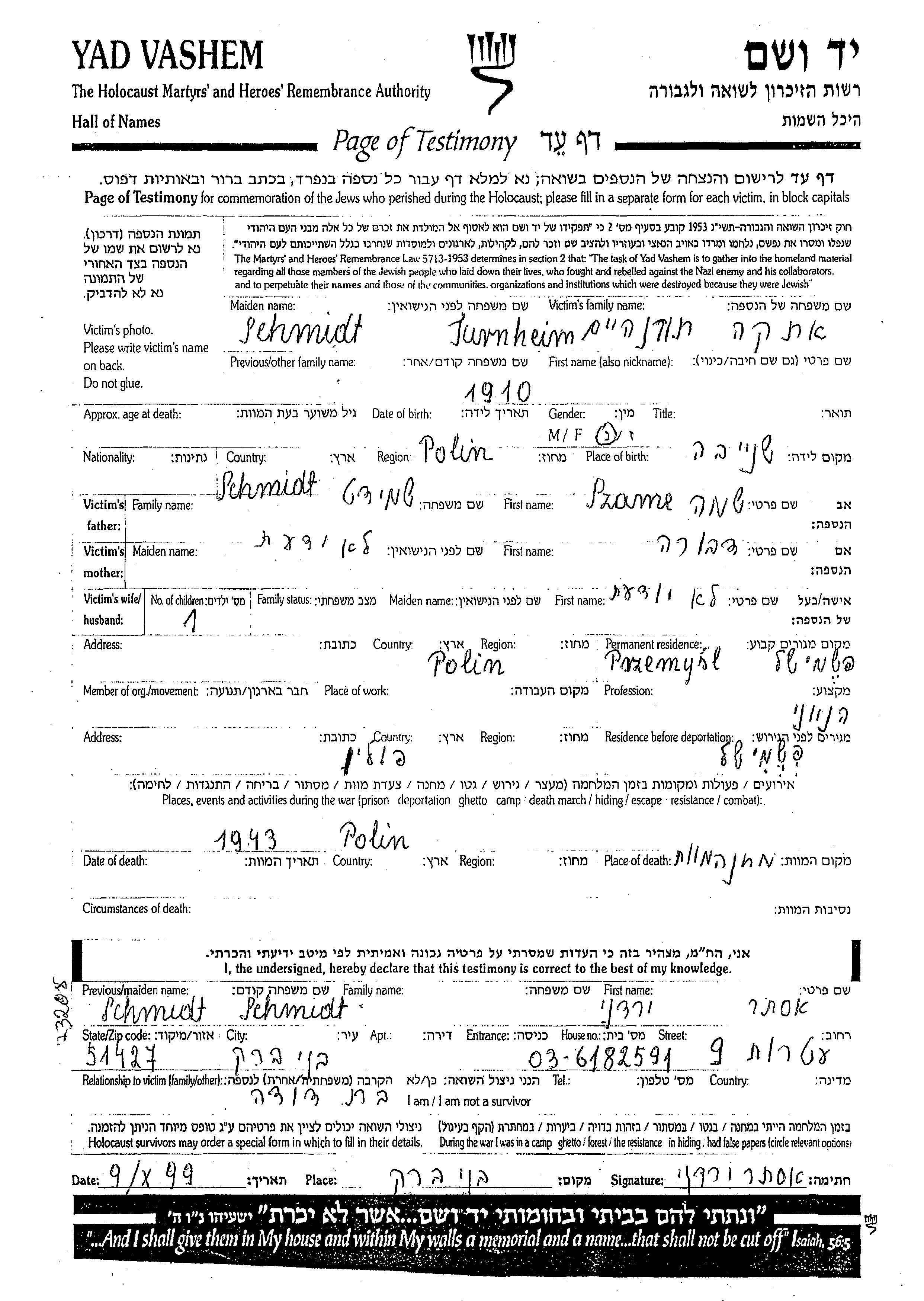 Этка Турнхейм, девичья фамилия Шмидт, место рождения: Сенява, Польша. Отец: Шаме, mать:Двора. Бакалейщик / бакалейщица. Женат / замужем. Место жительства до войны: Пшемысль, Польша. Место во время войны: Пшемысль, Польша.