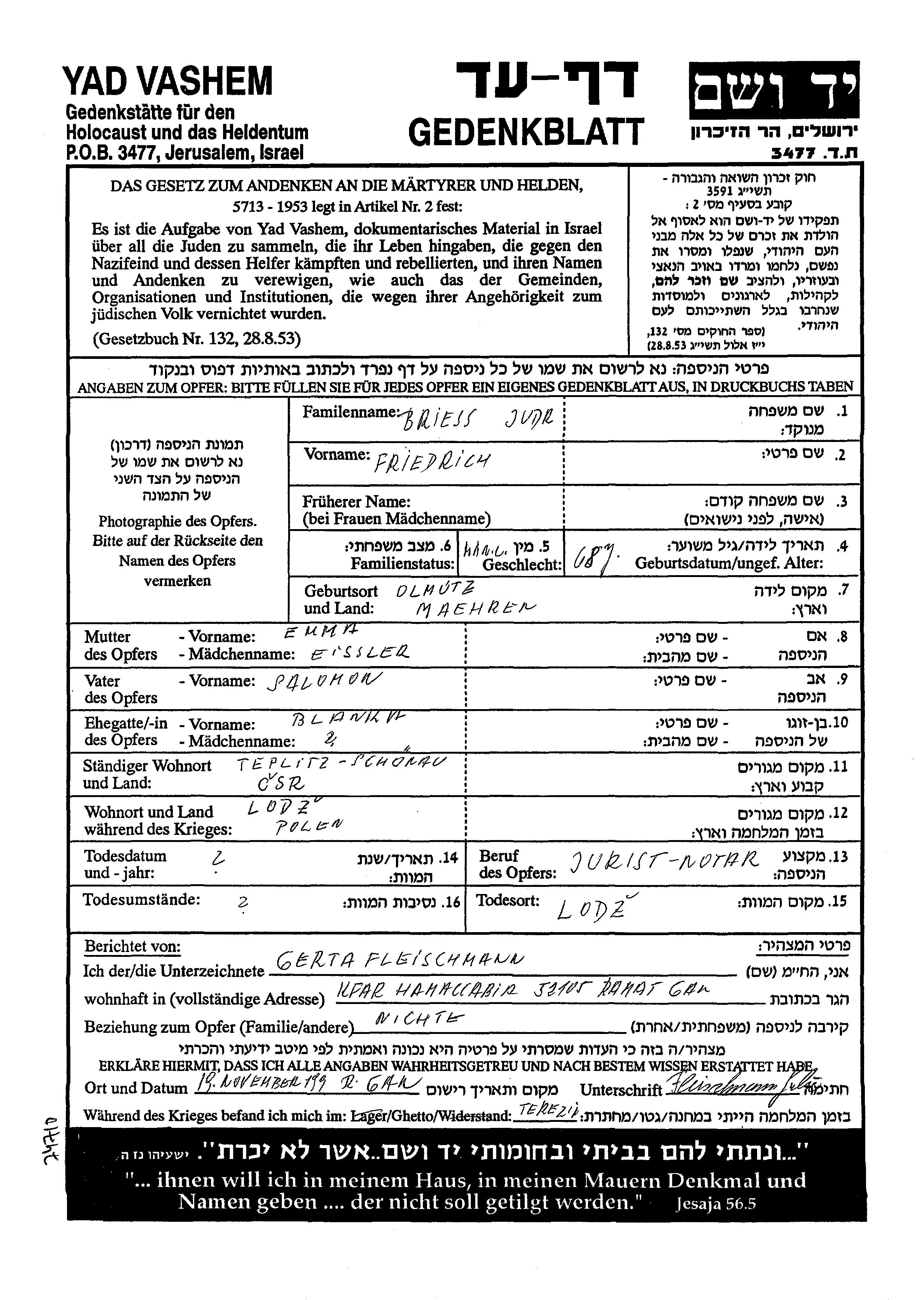 Др. Фридрих Брисс, место рождения: Ольмуц, Чехословакия. Отец: Саломон, mать:Эмма. Юрист. Женат / замужем. Место жительства до войны: Теплиц-Шенау, Чехословакия. Место во время войны: Лодзь, Польша.