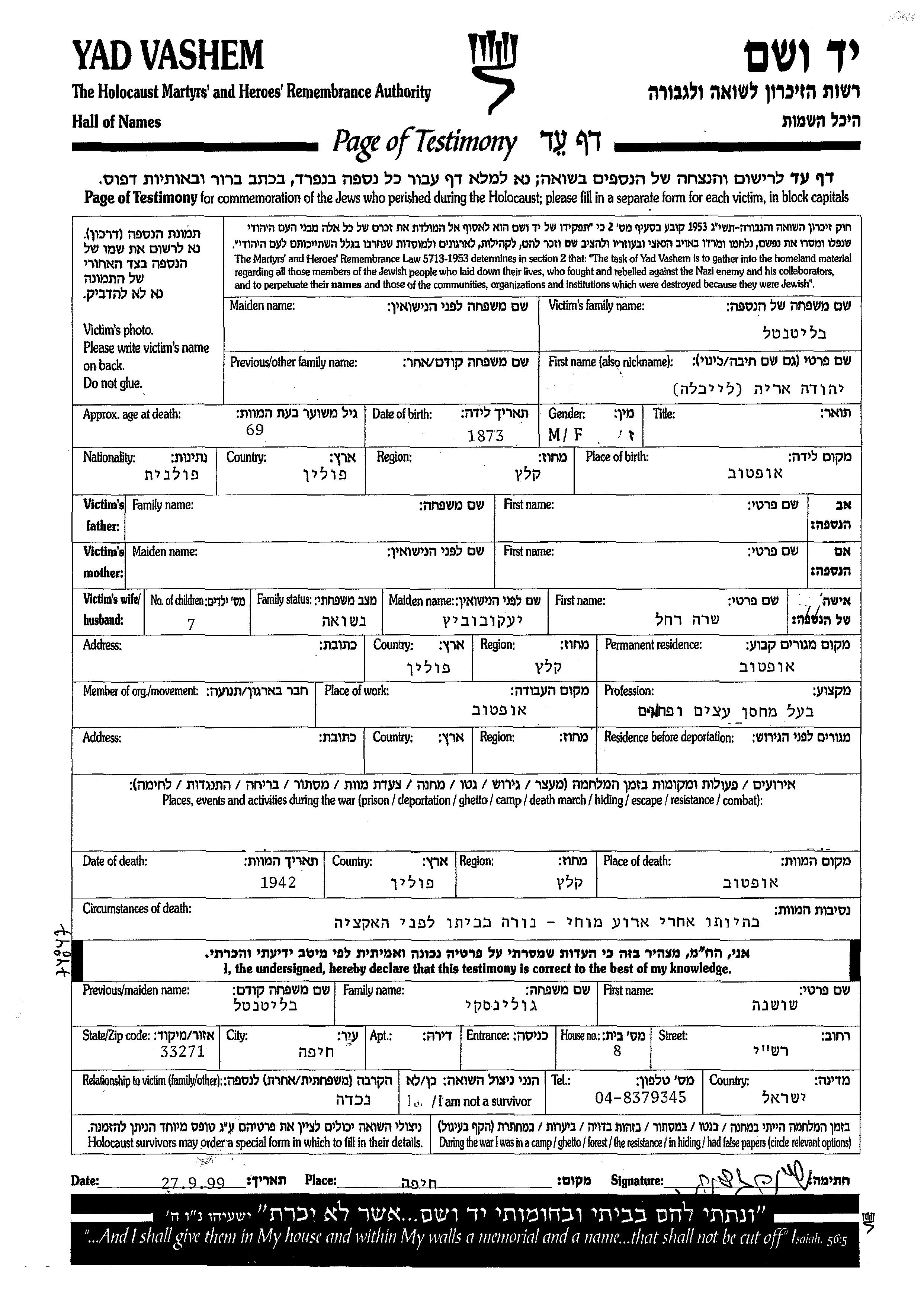 Яд Вашем - Листы свидетельских показаний Мемориального фонда