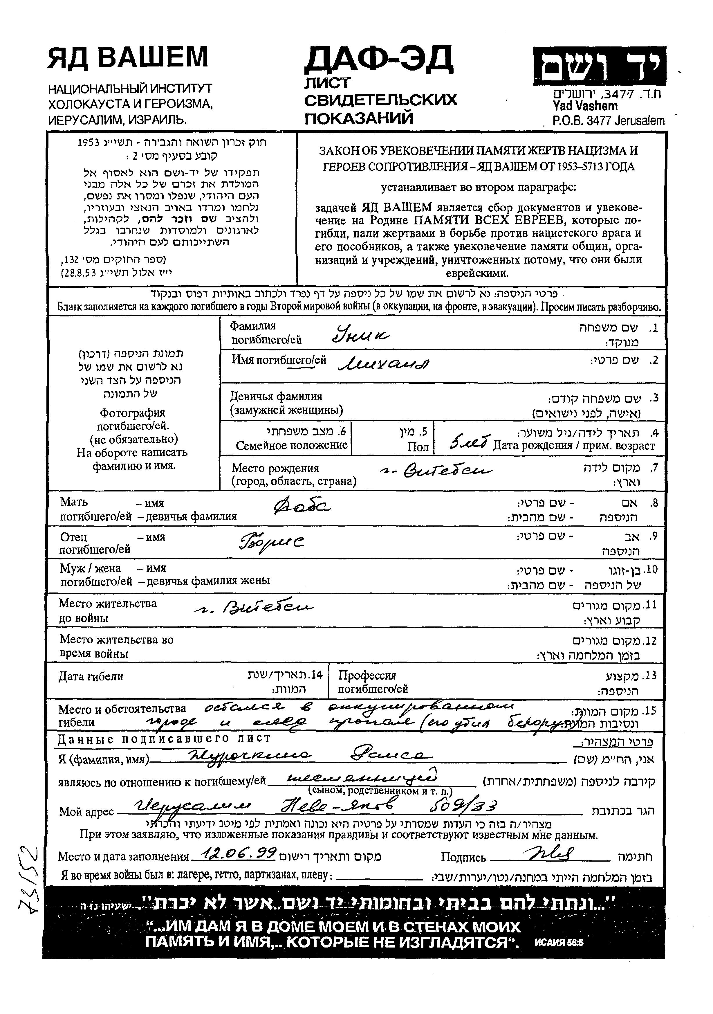 Уник Михаил Витебск, Белоруссия (СССР) Лист свидетельских показаний