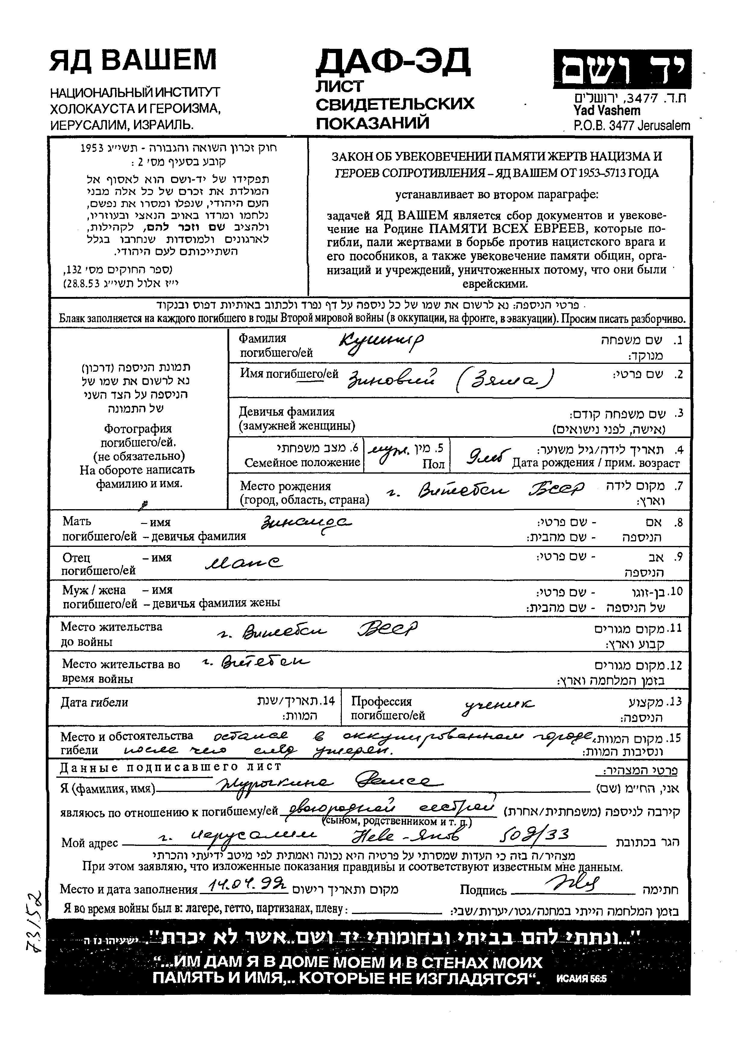 Кушнир Зиновий Витебск, Белоруссия (СССР) Лист свидетельских показаний