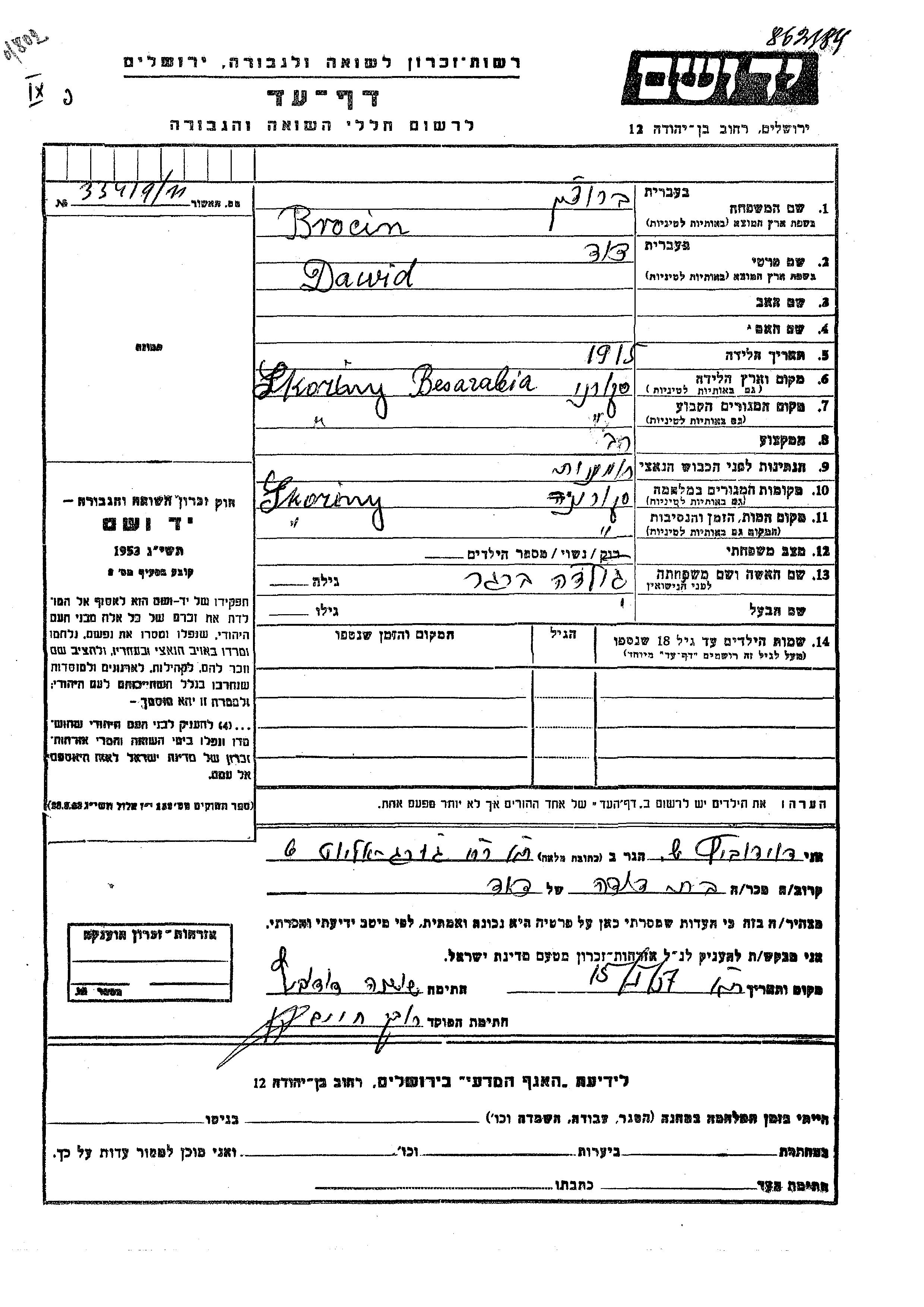 Броцин Давид 1915 Секуряны, Румыния Лист свидетельских показаний