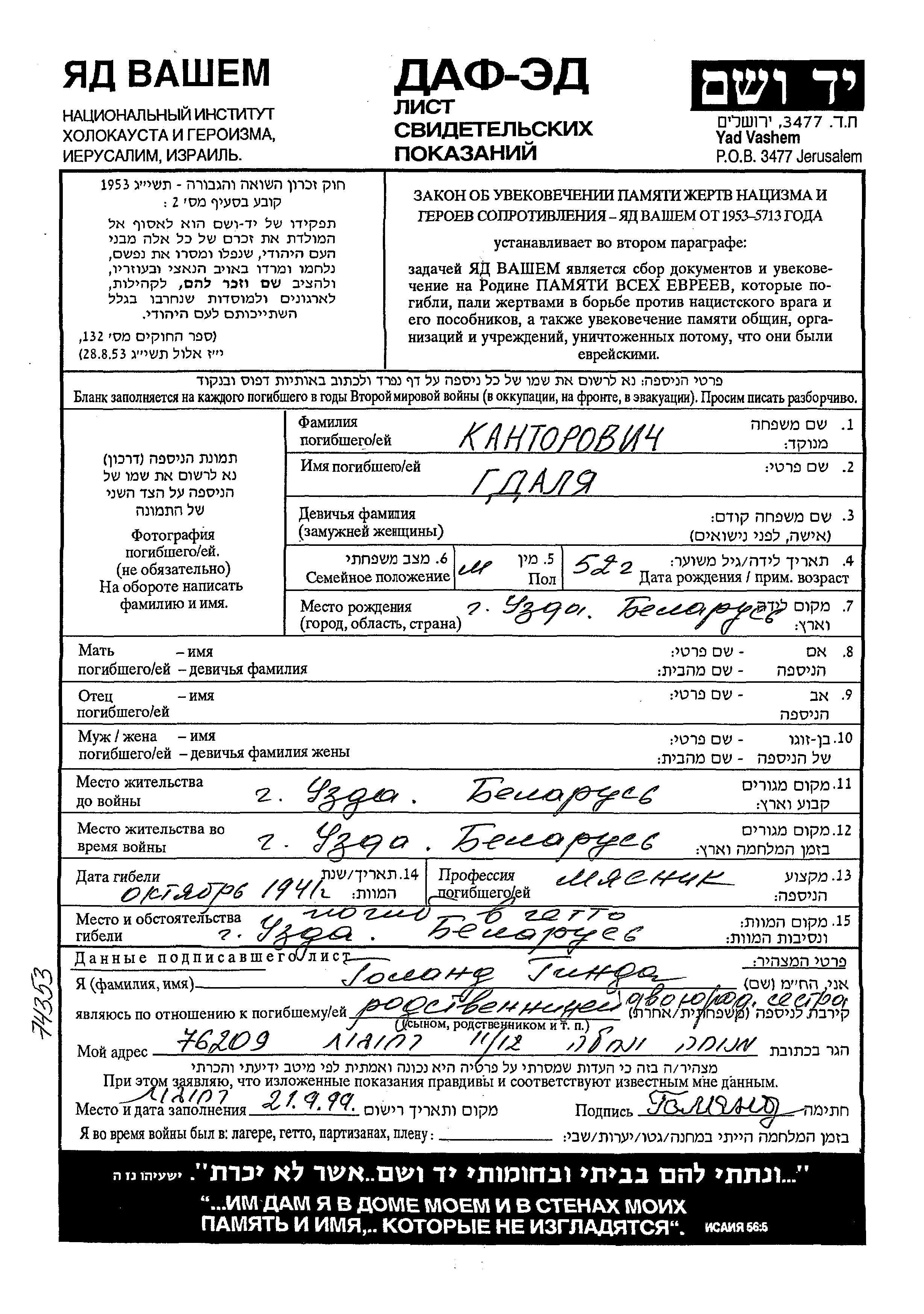 Канторович Гдаля Узда, Белоруссия (СССР) Лист свидетельских показаний