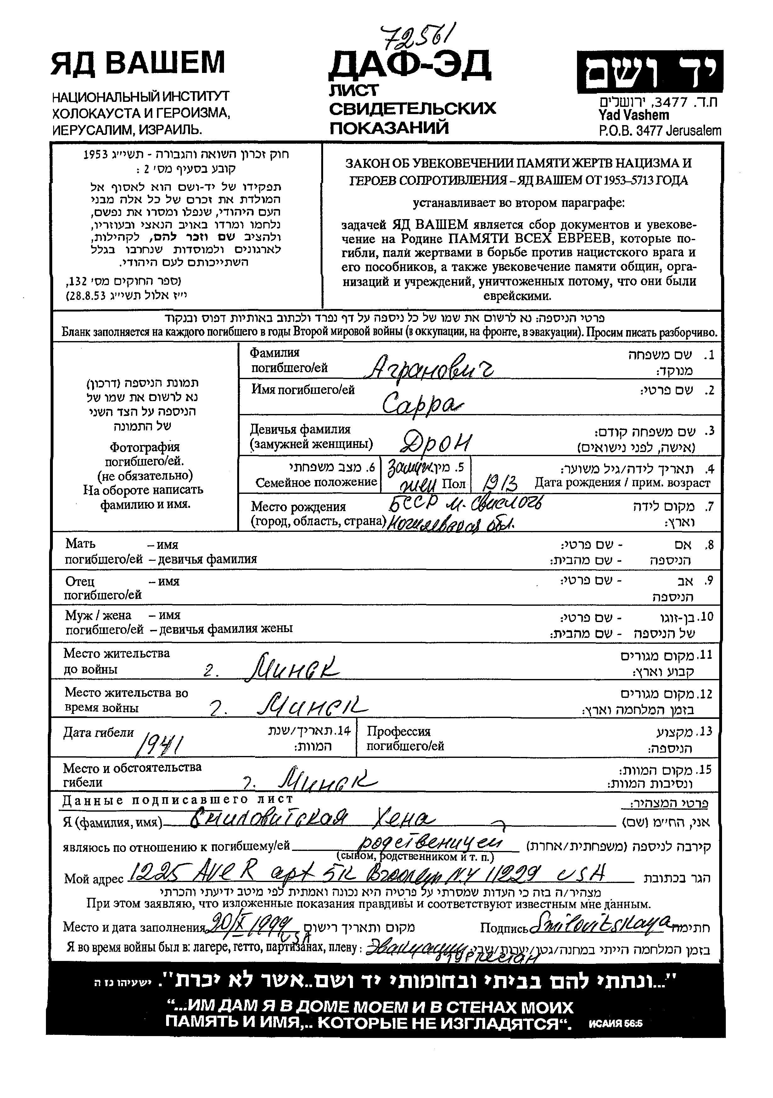 Агранович Сарра 1912 Минск, Белоруссия (СССР) Лист свидетельских показаний