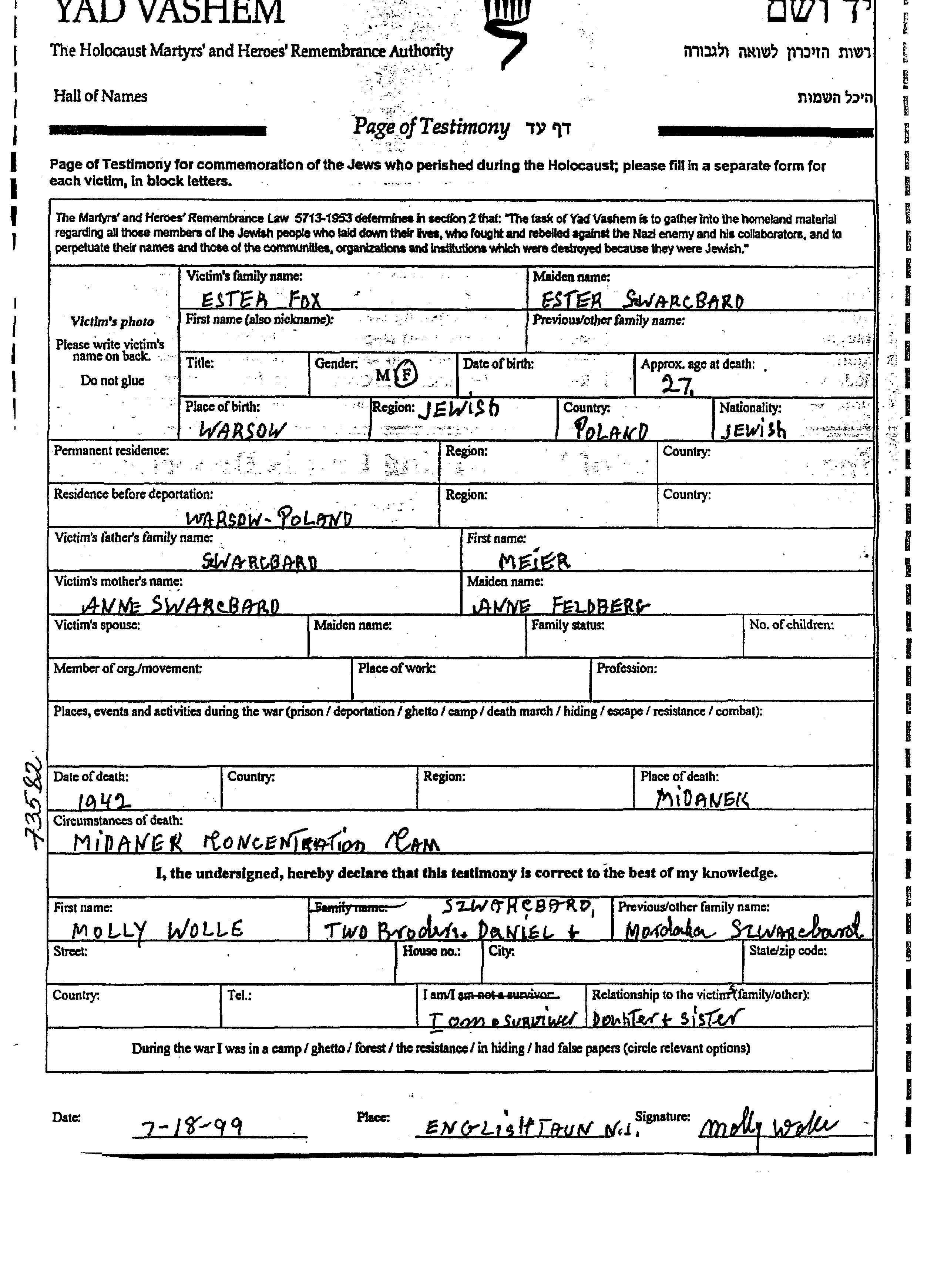 Эстер Фокс, девичья фамилия Шварцбард, место рождения: Варшава, Польша. Отец: Меир, mать:Анне. Женат / замужем. Место во время войны: Варшава, Польша.
