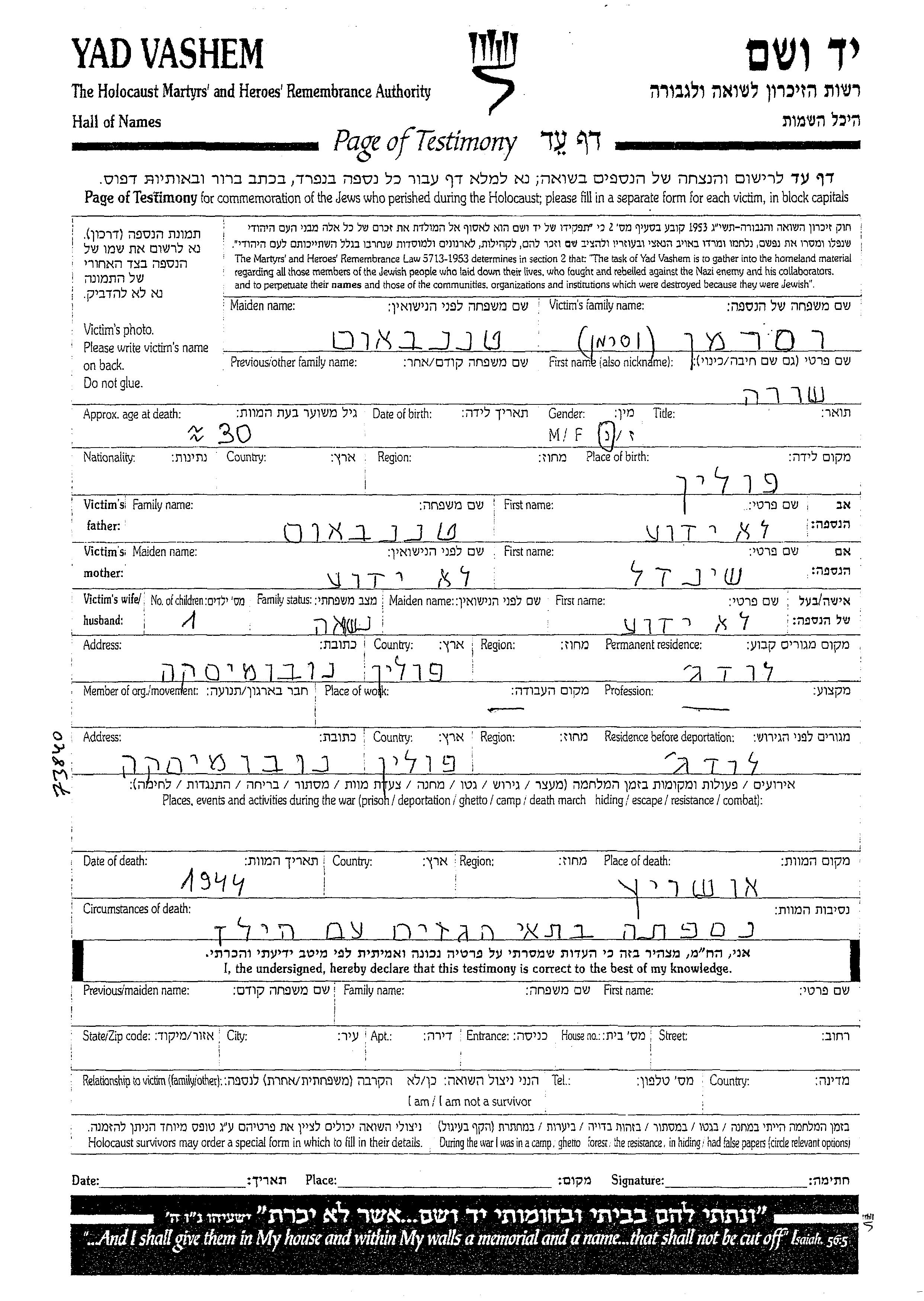 Шура Васерман, девичья фамилия Таненбаум, место рождения: Польша.Mать:Шейндел. Женат / замужем. Место жительства до войны: Лодзь, Польша. Место во время войны: Лодзь, Польша.