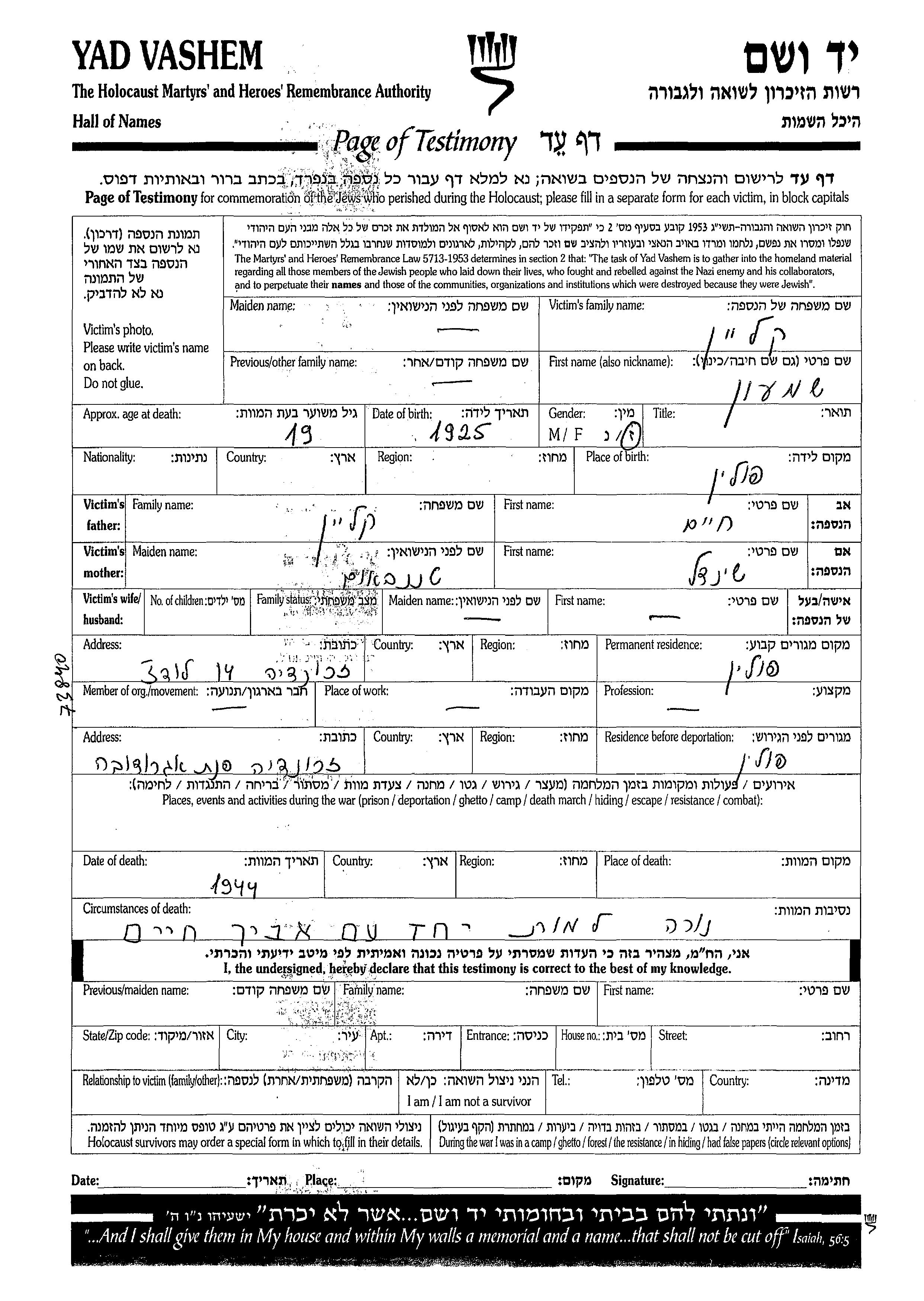 Яд Вашем - Листы свидетельских показаний Мемориального фонда