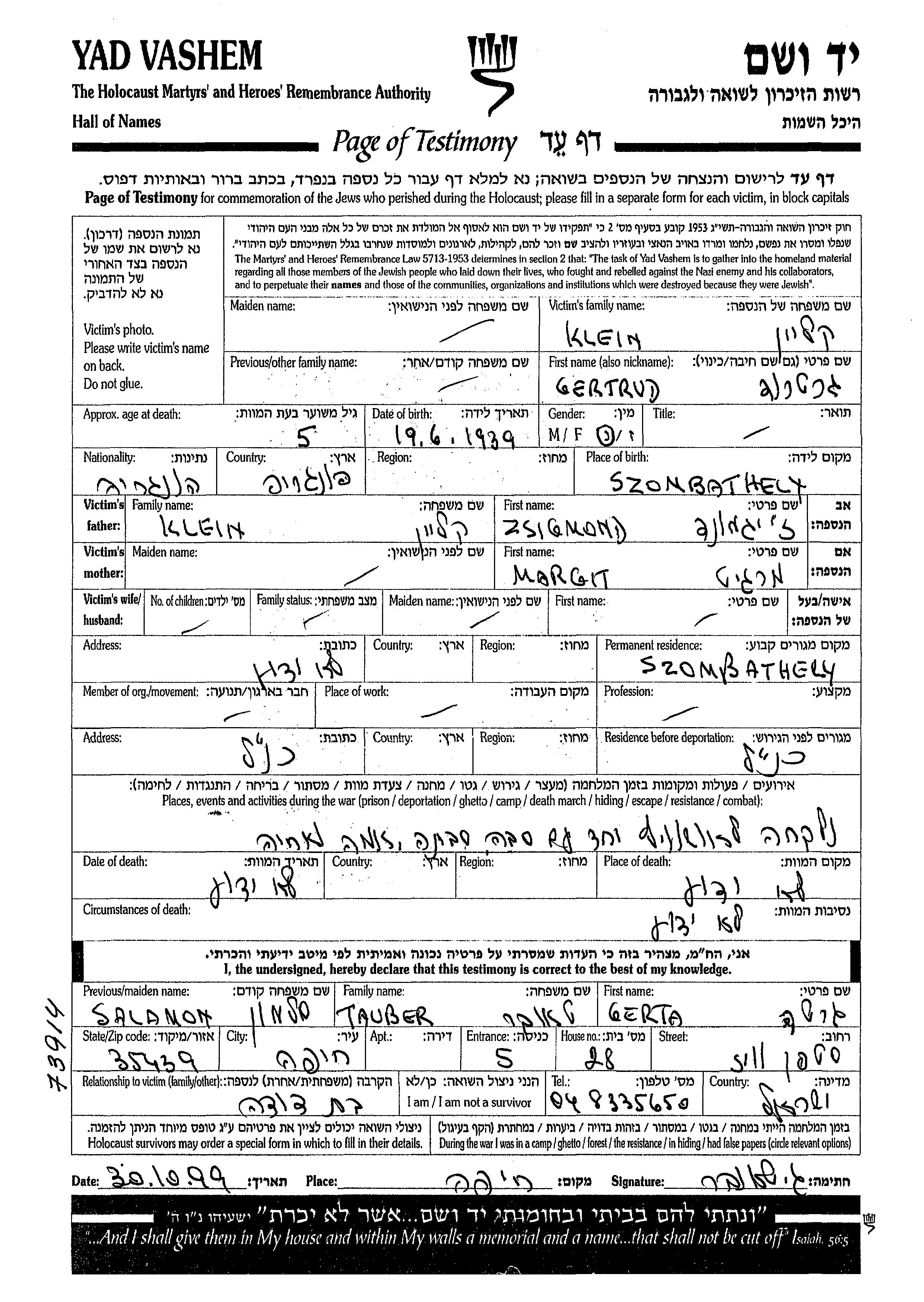 Клейн Гертруд 1939 Сомбатхей, Венгрия Лист свидетельских показаний