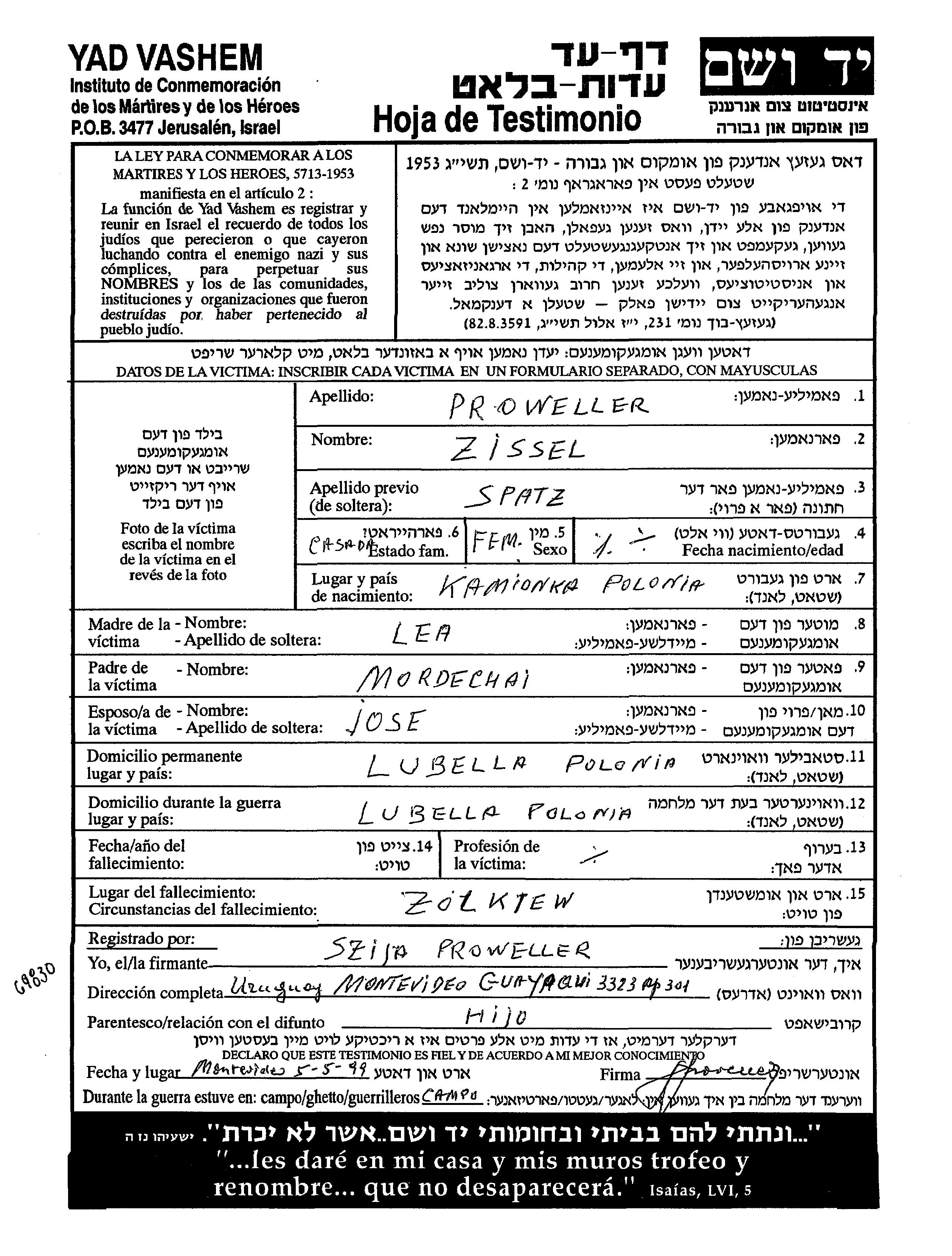 Зиссел Провеллер, девичья фамилия Шпац, место рождения: Каменка, Польша. Отец: Мордехай, mать:Лея. Женат / замужем. Место жительства до войны: Любеля, Польша. Место во время войны: Любеля, Польша.
