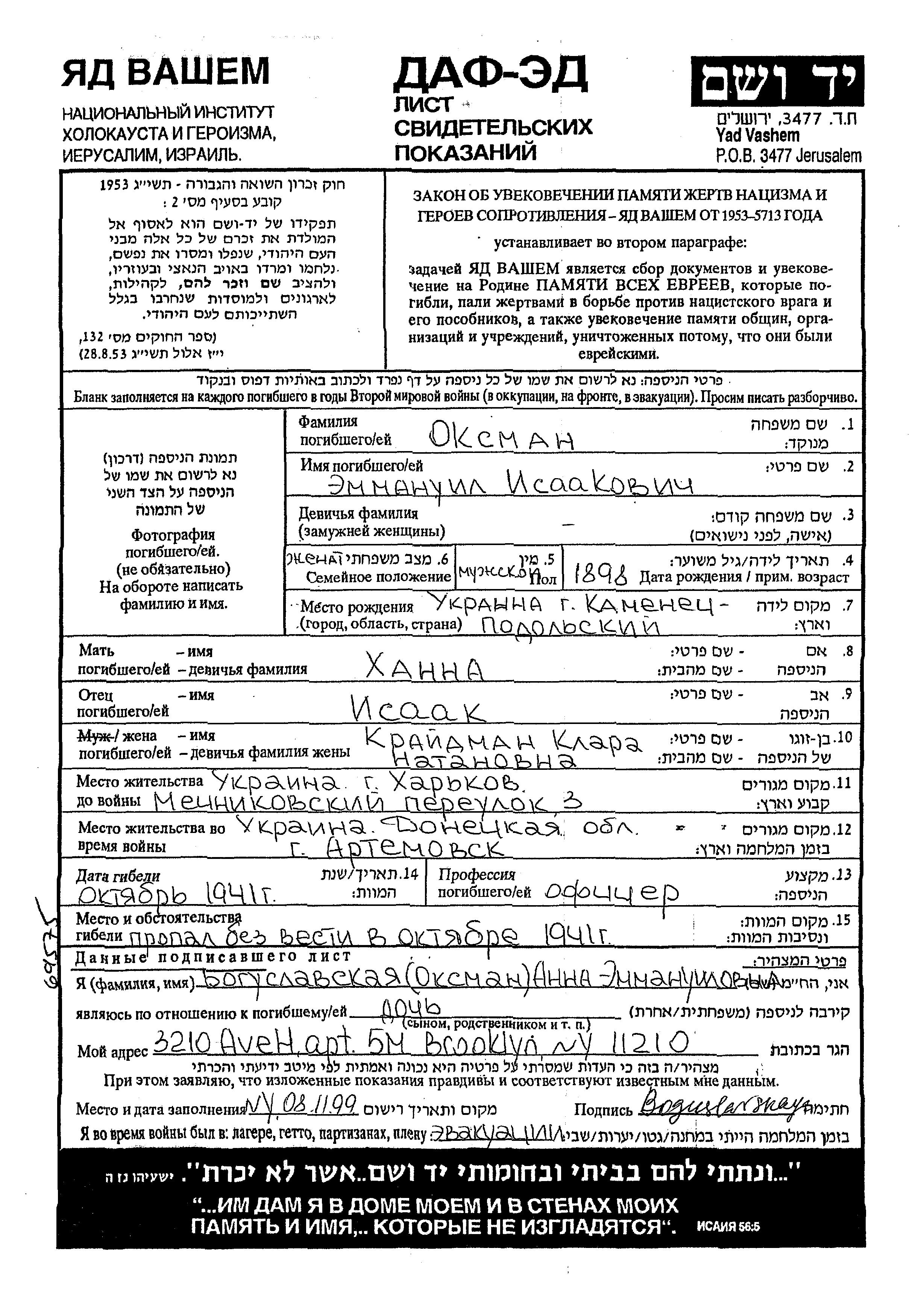 Яд Вашем - Листы свидетельских показаний Мемориального фонда