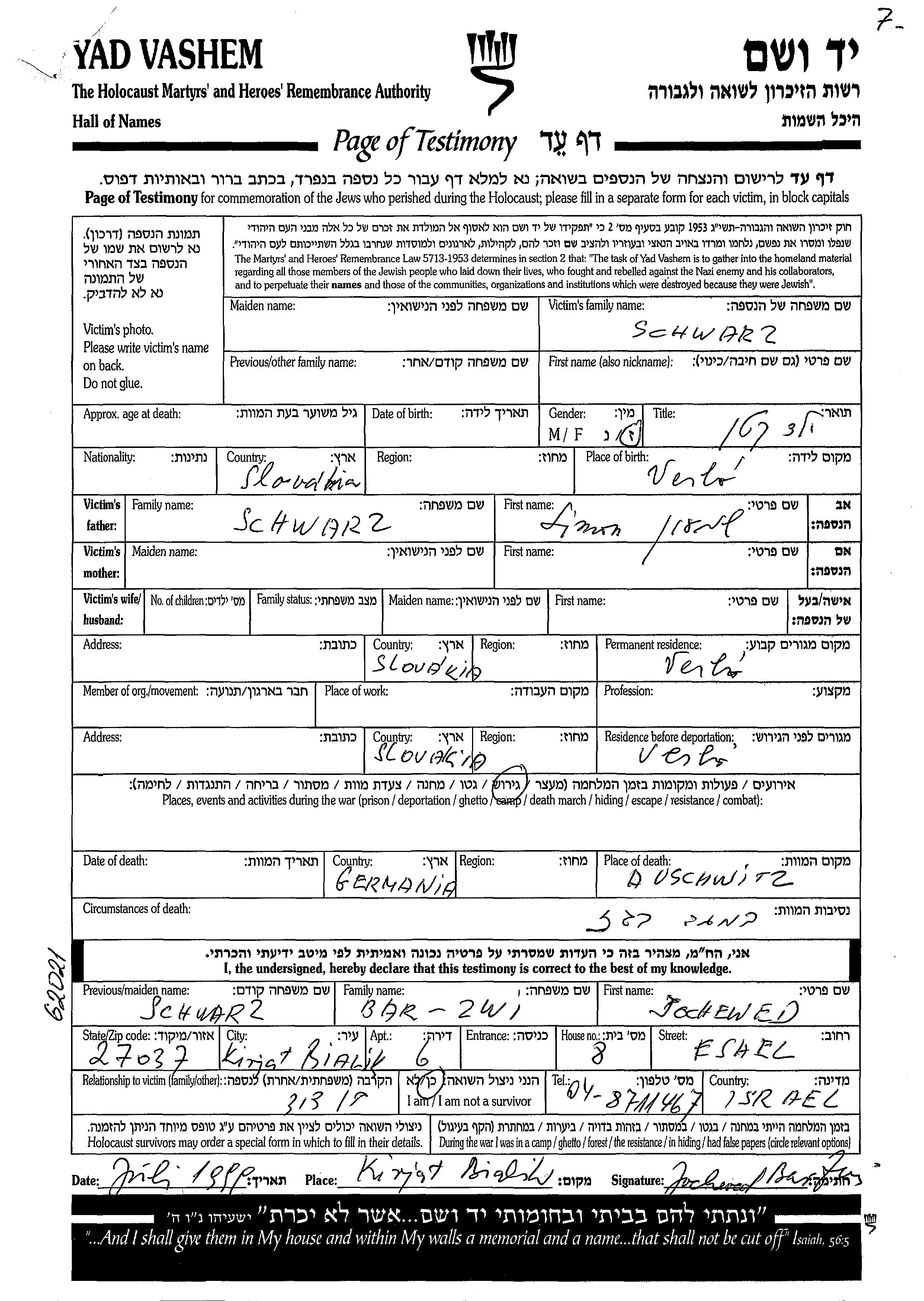 Шварц Имя неизвестно Вербо, Чехословакия Лист свидетельских показаний
