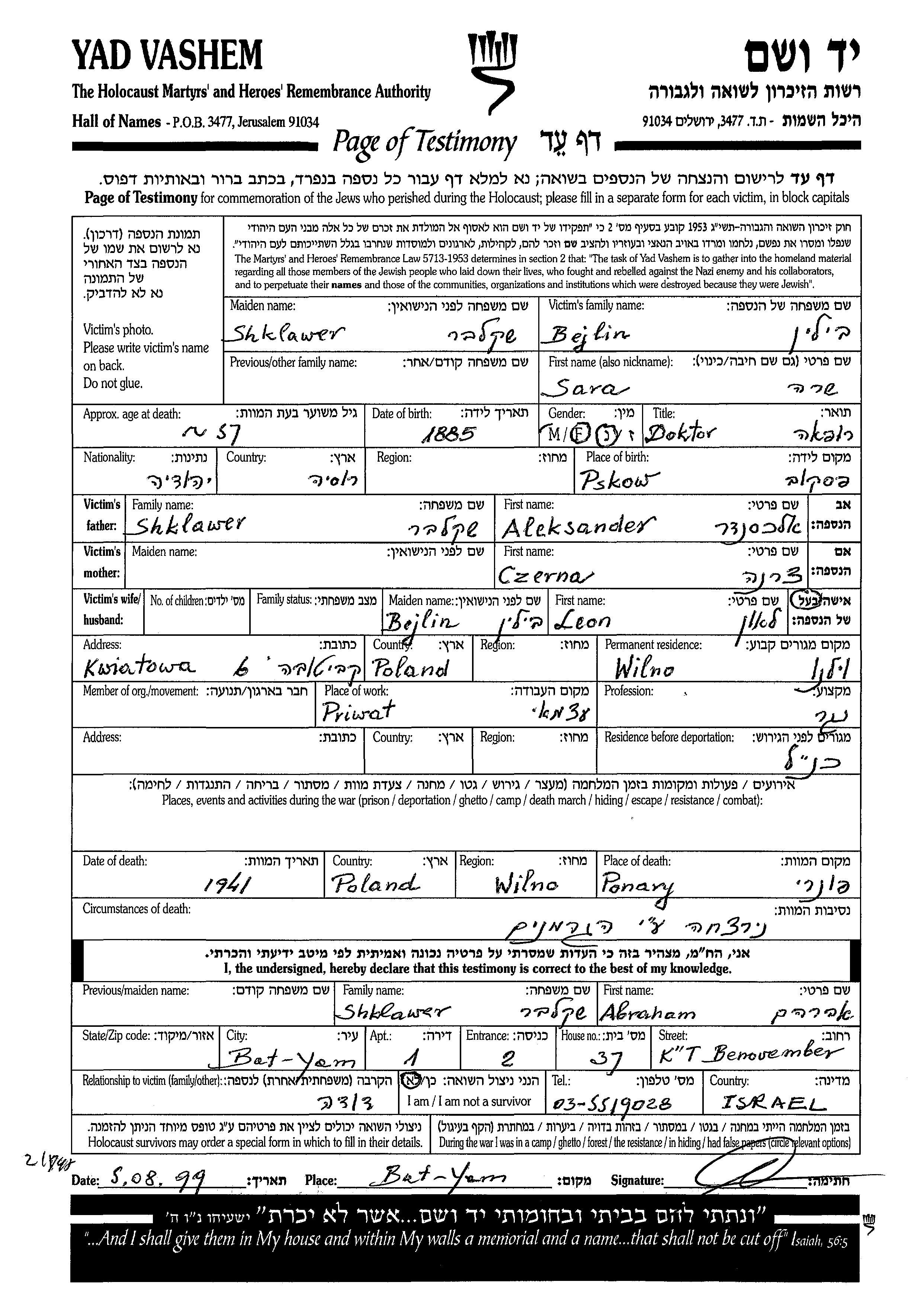 Др. Сара Бейлин, девичья фамилия Шклавер, место рождения: Псков, Россия (СССР). Отец: Александер, mать:Черна. Врач. Женат / замужем. Место жительства до войны: Вильно, Польша. Место во время войны: Вильно, Польша.