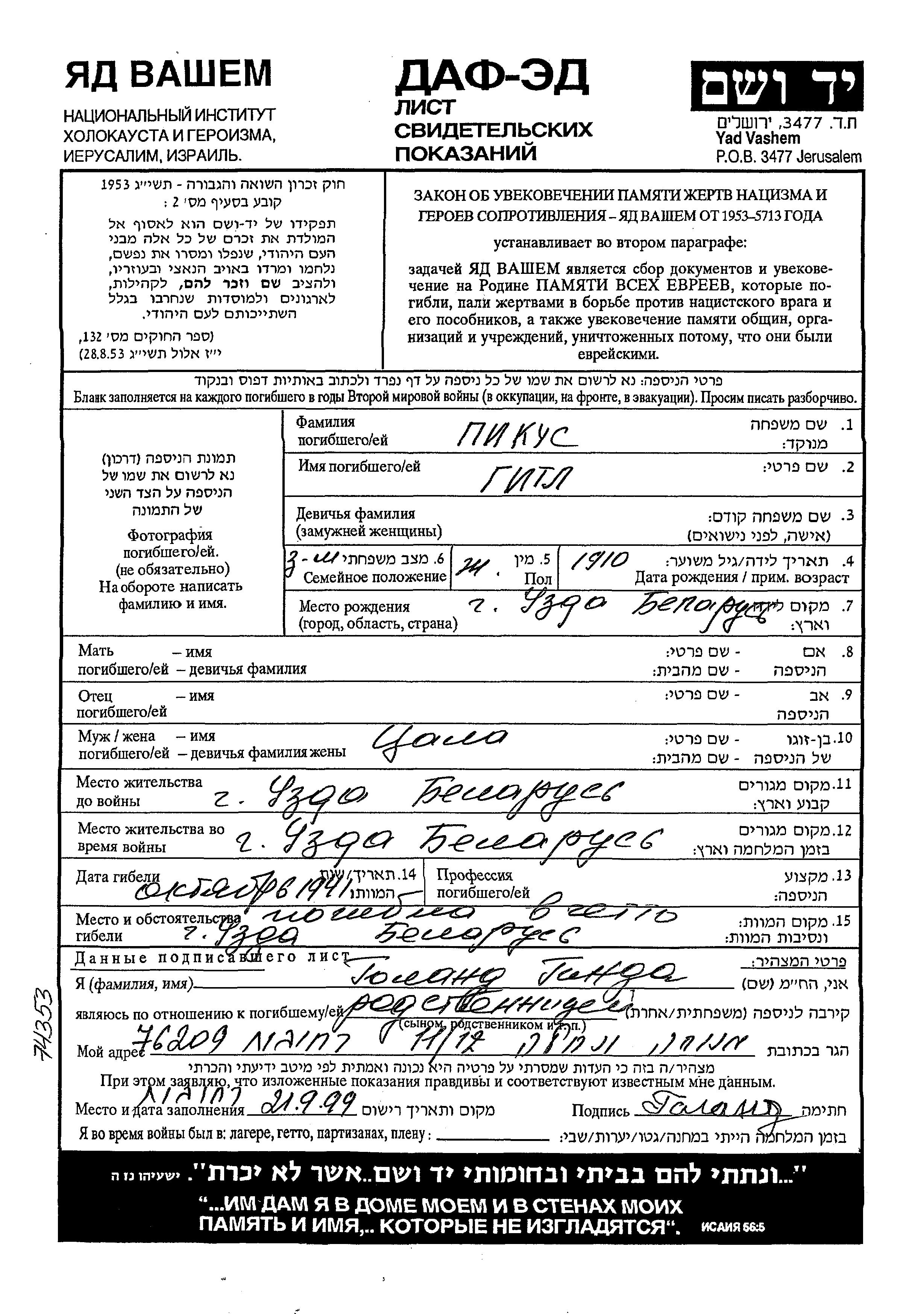 Пикус Гитл 1910 Узда, Белоруссия (СССР) Лист свидетельских показаний