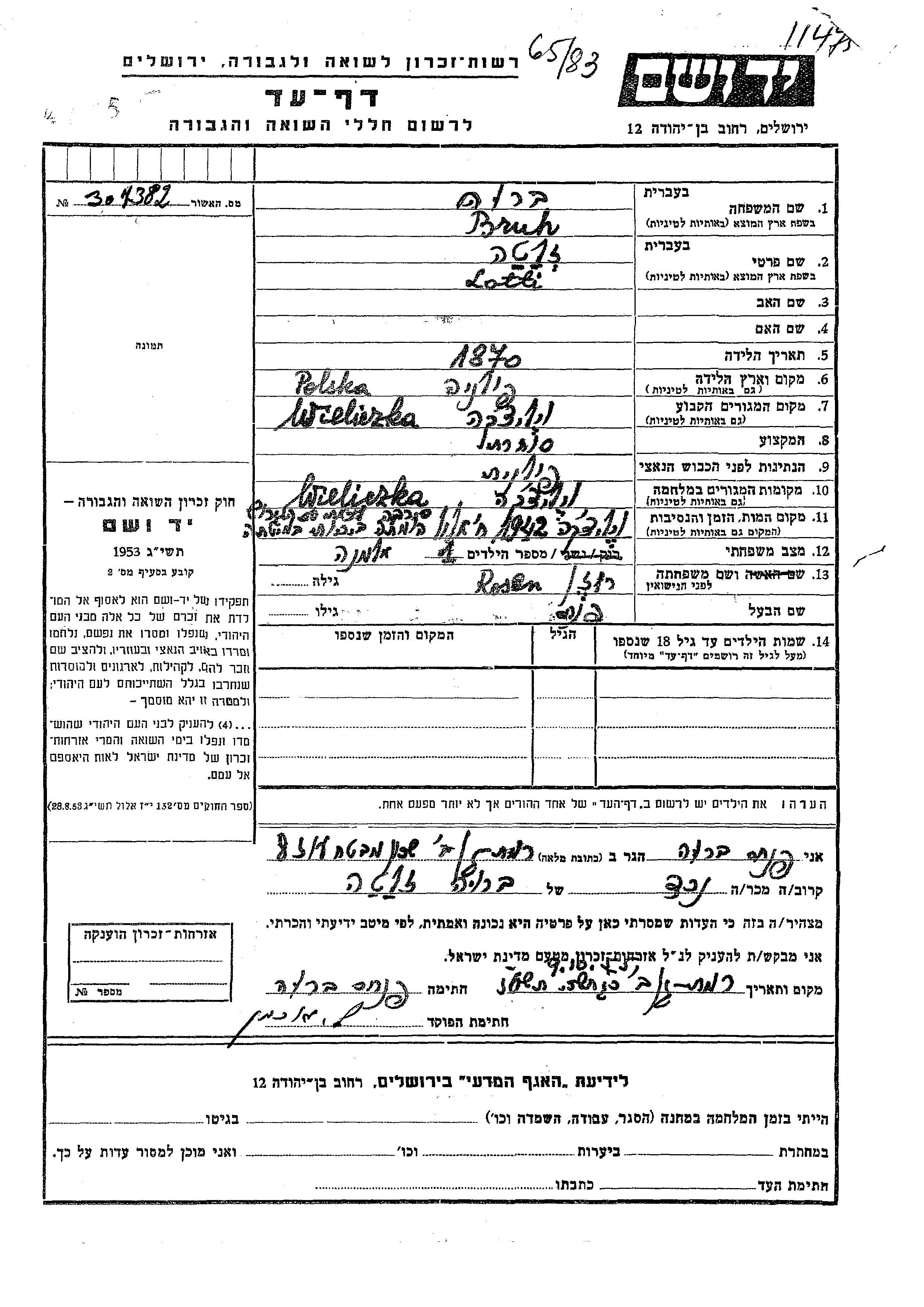 Лотти Злата Бру Барух, девичья фамилия Розен, место рождения: Польша. Торговец / торговка. Вдова. Место жительства до войны: Величка, Польша. Место во время войны: Величка, Польша.