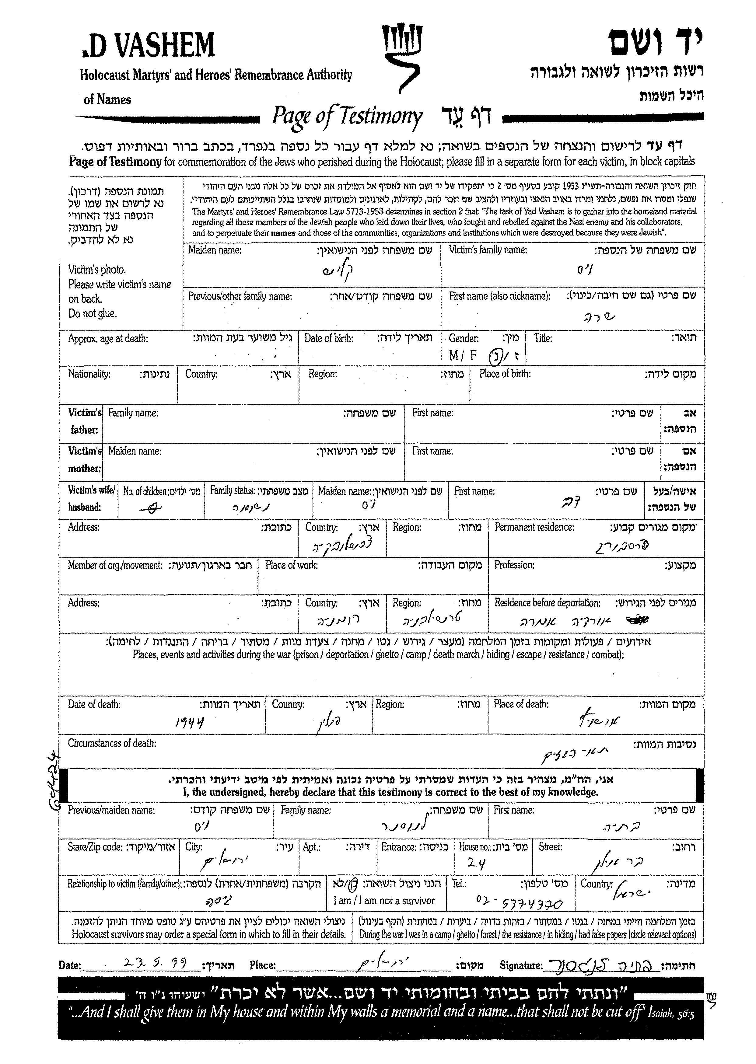 Яд Вашем - Листы свидетельских показаний Мемориального фонда