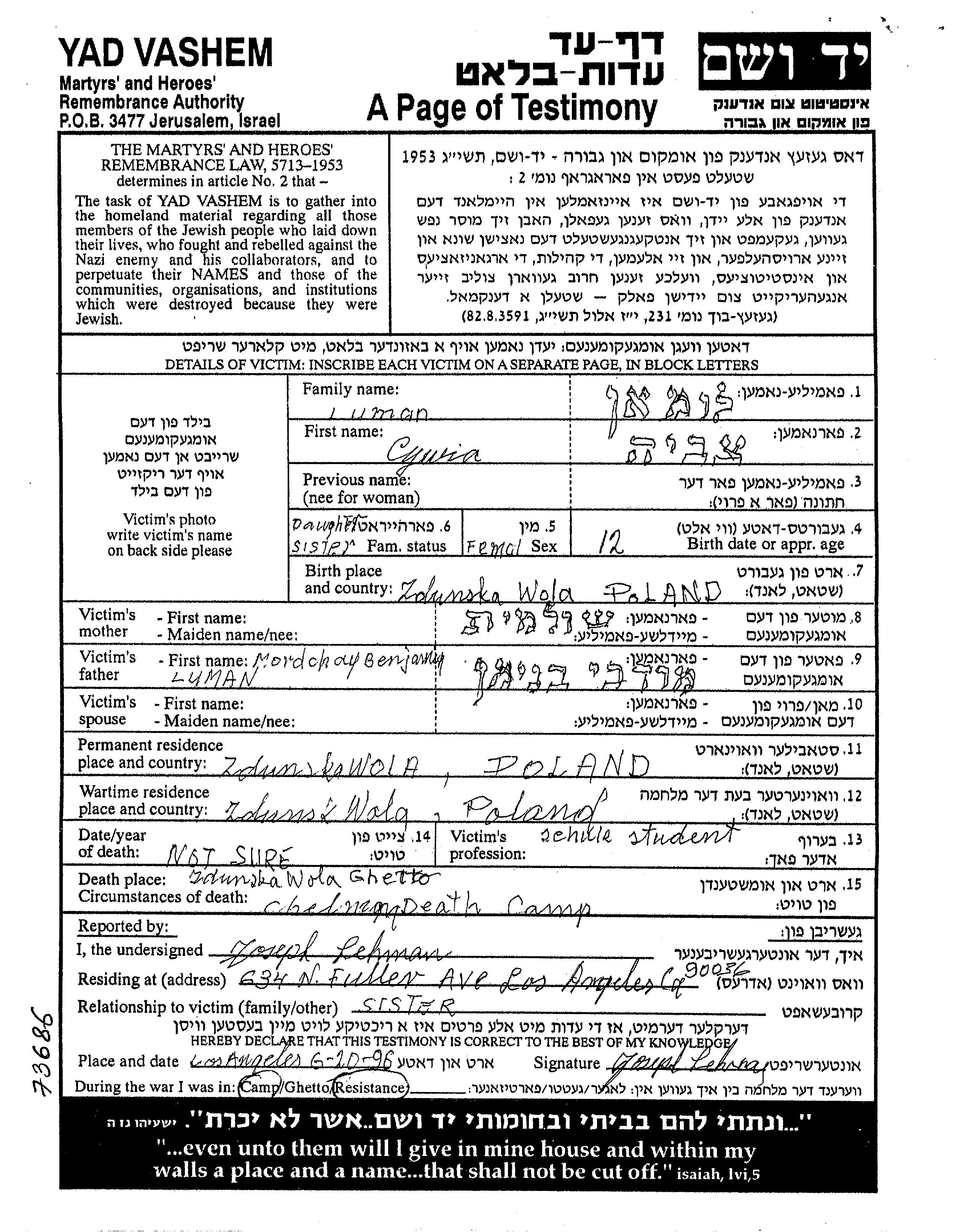 Цивия Луман, место рождения: Здуньска-Воля, Польша. Отец: Мордхай Беньямин, mать:Шуламит. Школьник / школьница. Ребенок. Место жительства до войны: Здуньска-Воля, Польша. Место во время войны: Здуньска-Воля, Польша.