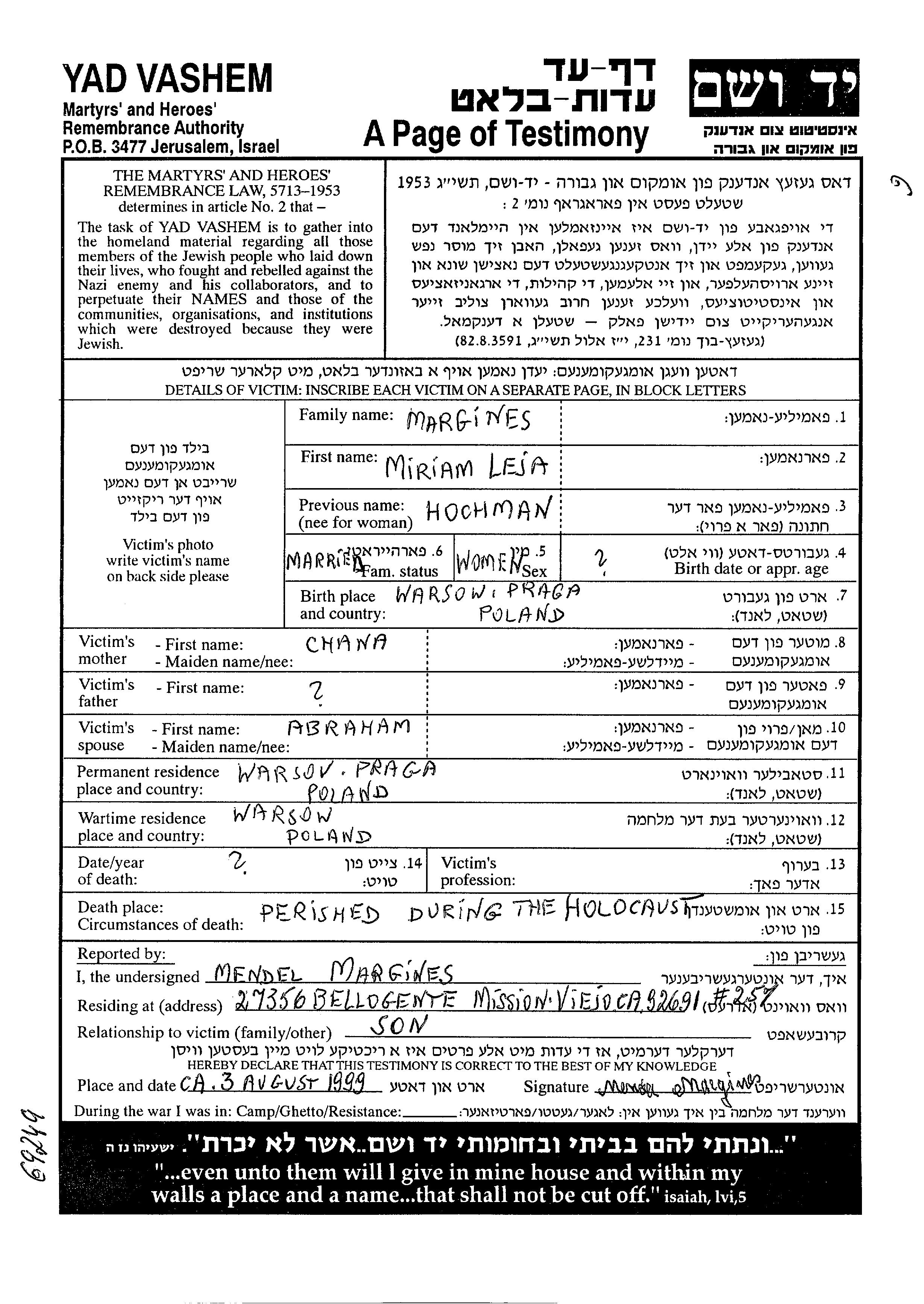 Мирьям Лея Маргинес, девичья фамилия Хохман, место рождения: Прага, Польша.Mать:Хана. Женат / замужем. Место жительства до войны: Прага, Польша. Место во время войны: Варшава, Польша.