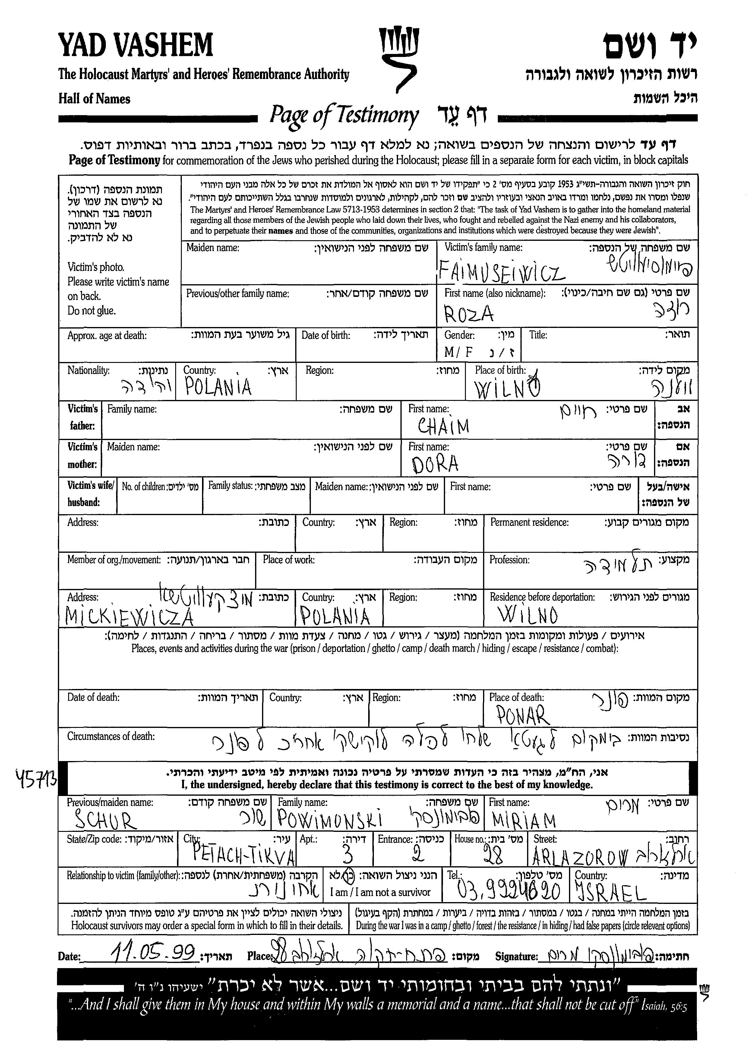Файмусевич Роза Вильно, Польша Лист свидетельских показаний