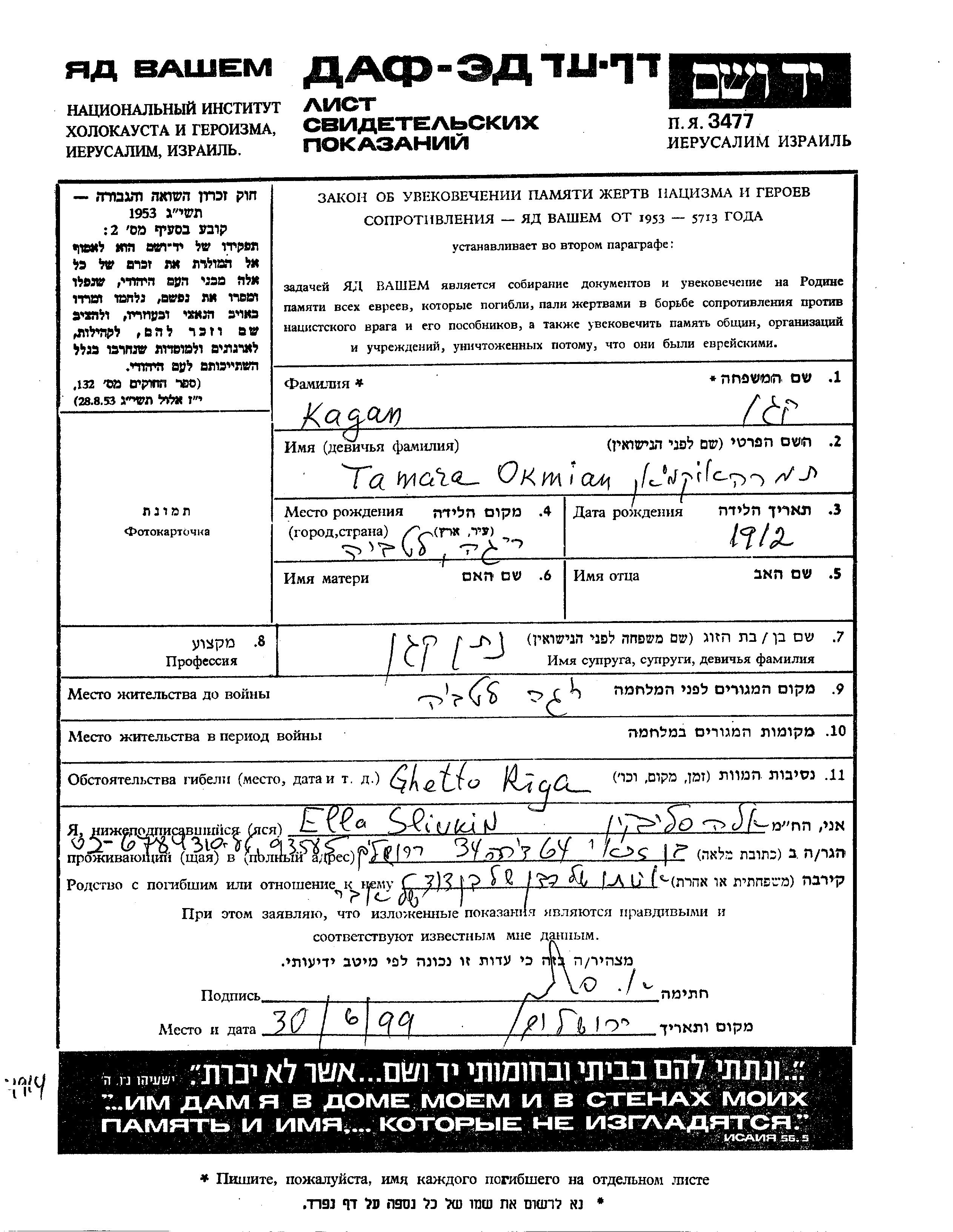 Каган Тамара 1912 Рига, Латвия Лист свидетельских показаний