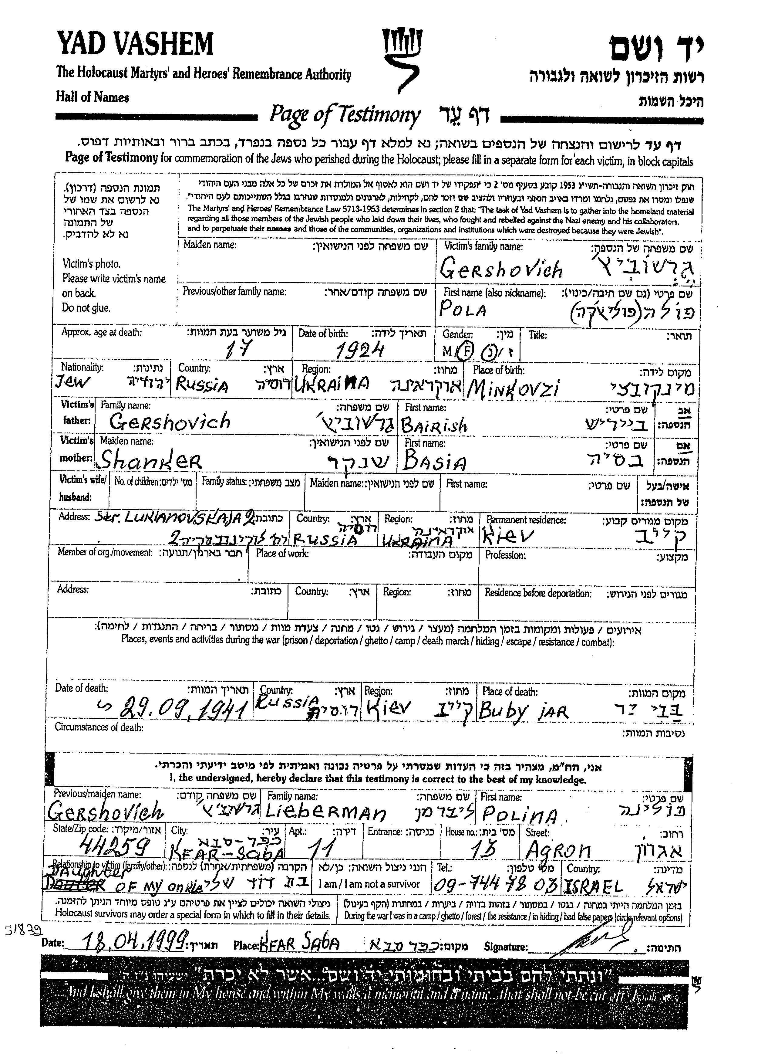 Пола Поличка Гершович, место рождения: Минковцы, Украина (СССР). Отец: Байриш Бейриш, mать:Бася. Место жительства до войны: Киев, Украина (СССР).