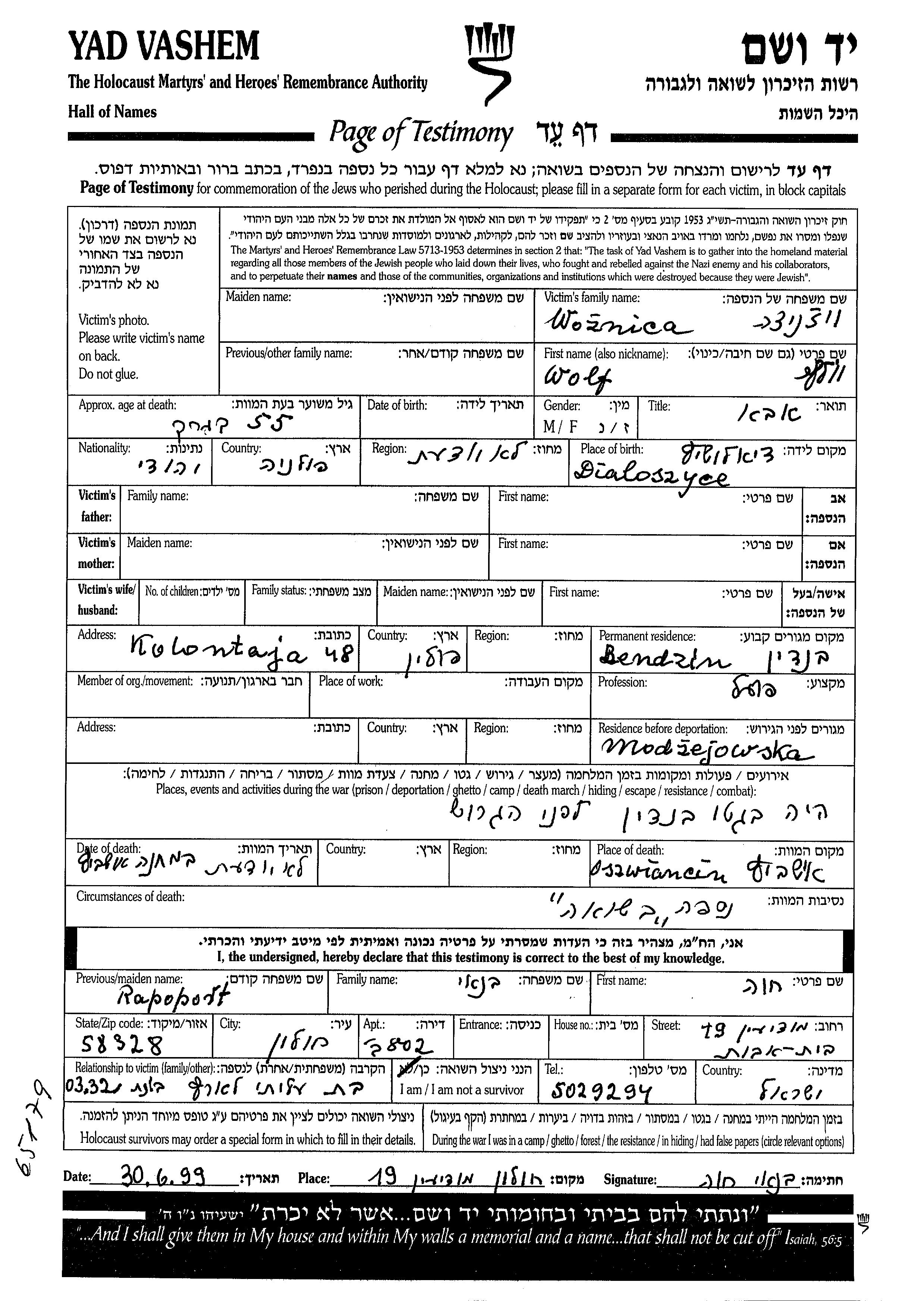 Вожница Вольф Бендзин, Польша Лист свидетельских показаний
