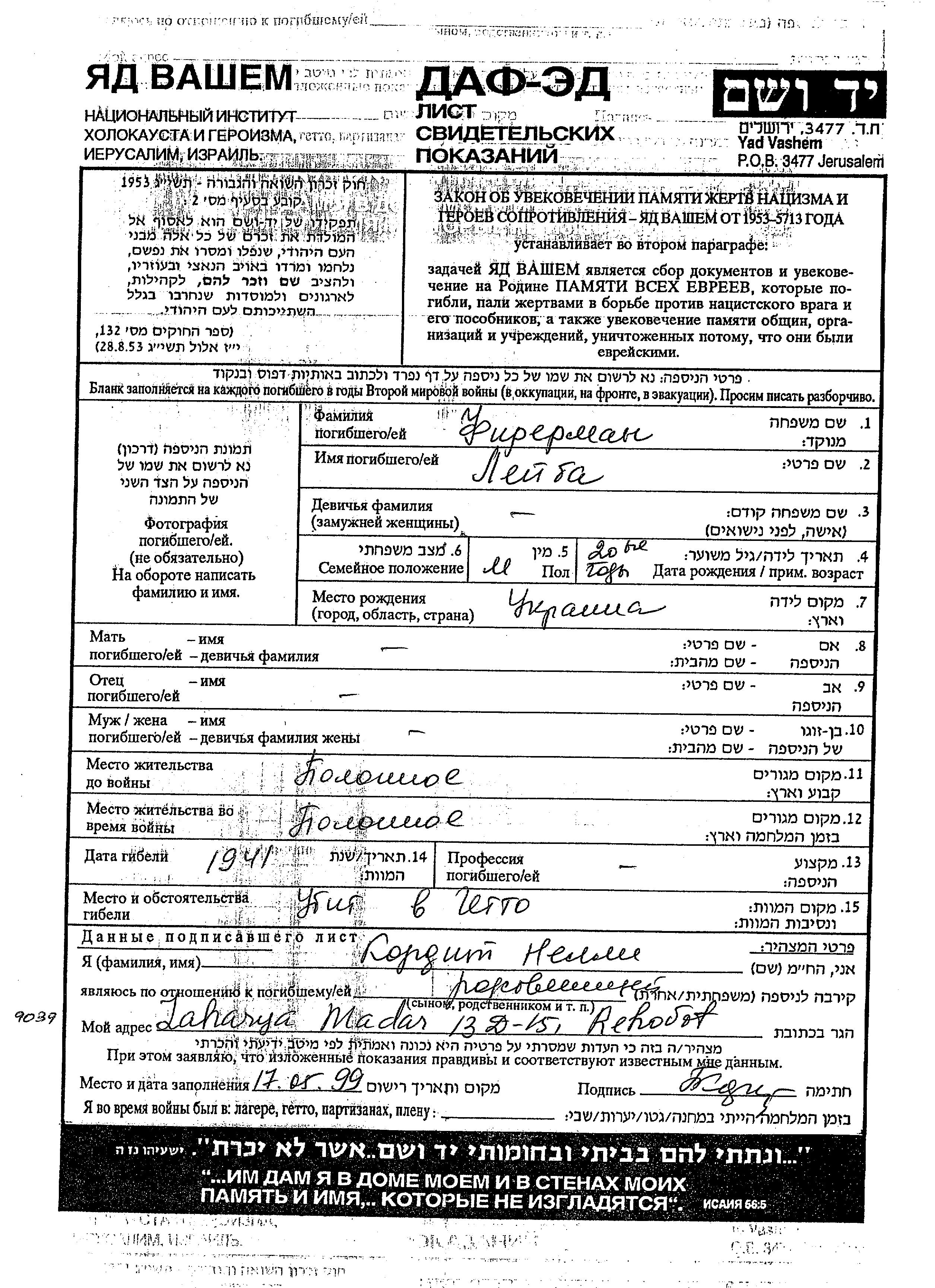 Лейба Фирерман, место рождения: Украина (СССР). Холост / не замужем. Место жительства до войны: Полонное, Украина (СССР). Место во время войны: Полонное, Украина (СССР).