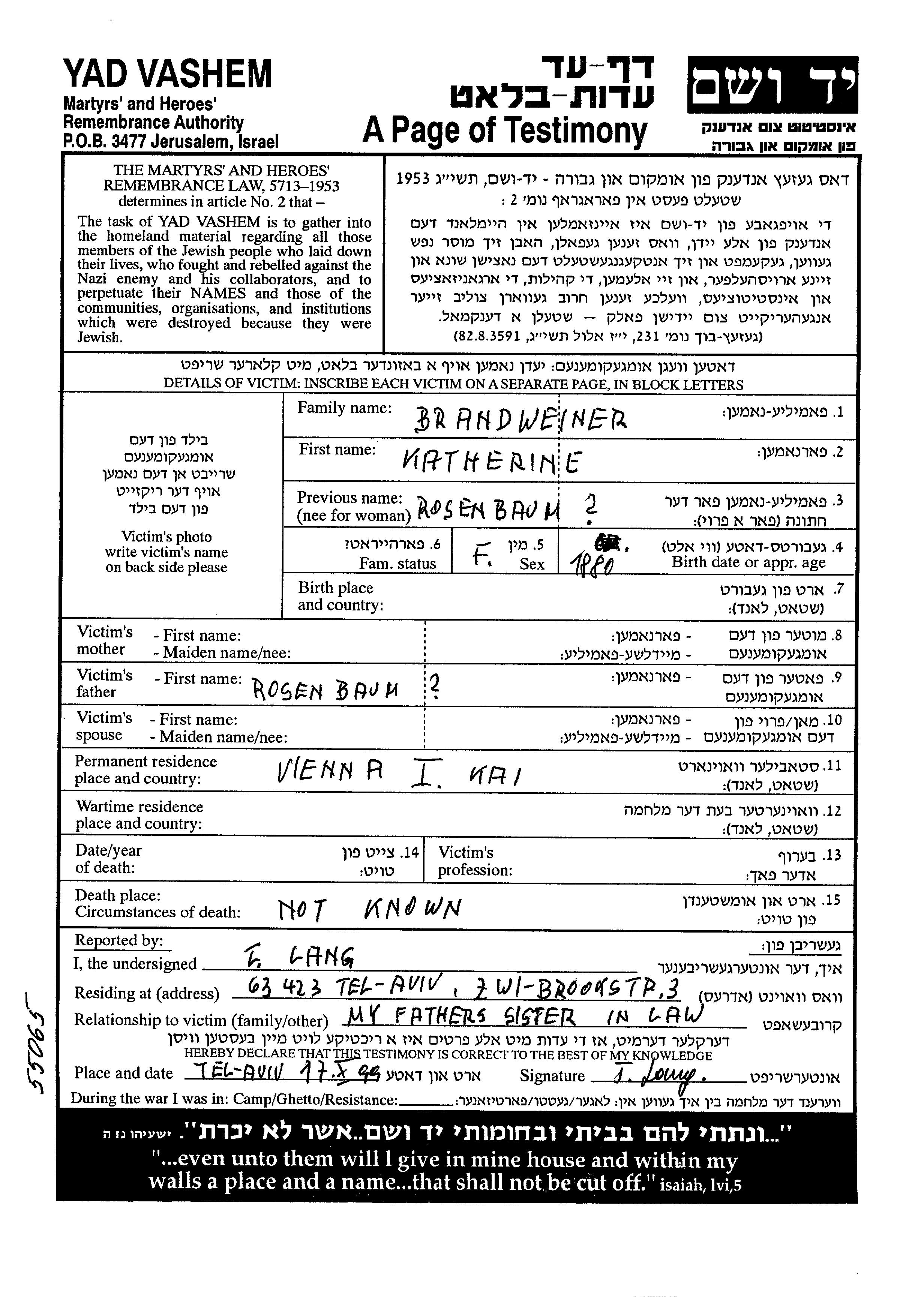 Катерине Брандвайнер, девичья фамилия Розенбаум. Женат / замужем. Место жительства до войны: Вена, Австрия.