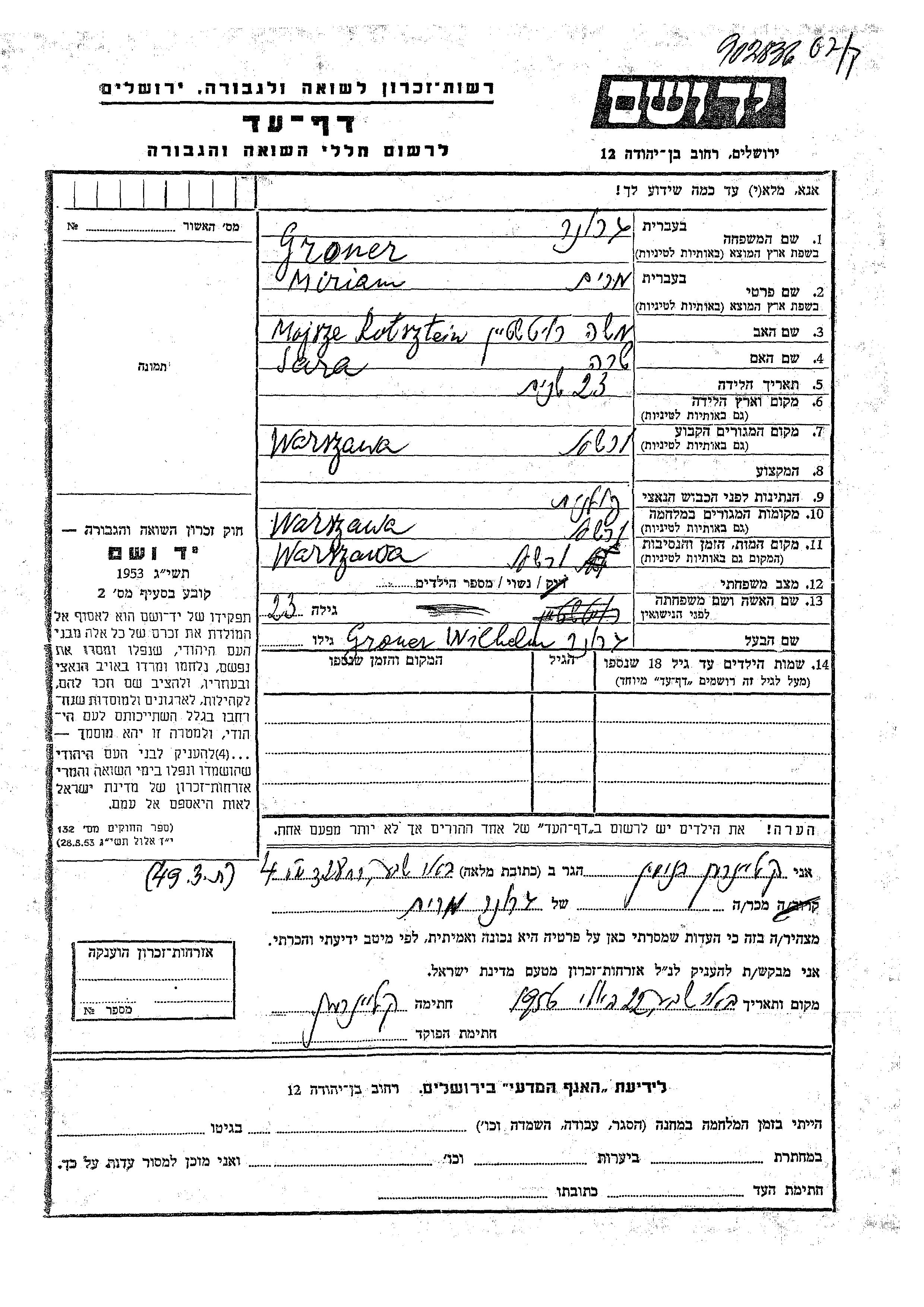Мирьям Гронер Грунер, девичья фамилия Ройтштейн Мойше Сара. Женат / замужем. Место жительства до войны: Варшава, Польша. Место во время войны: Варшава, Польша.