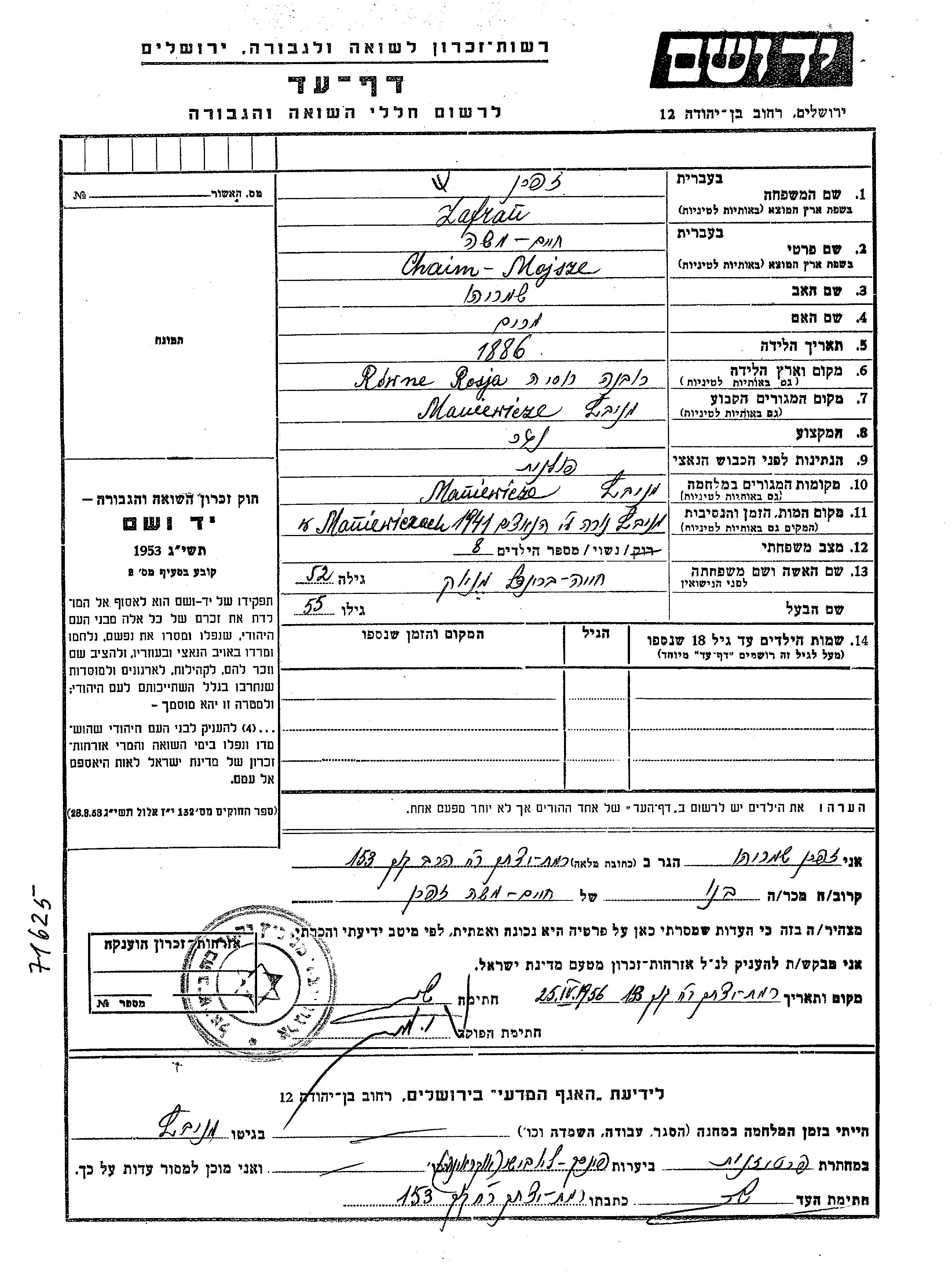 Хаим Мойше Зафран, место рождения: Ровно, Польша. Отец: Шмарьягу, mать:Мирьям. Столяр / плотник. Женат / замужем. Место жительства до войны: Маневичи, Польша. Место во время войны: Маневичи, Польша.