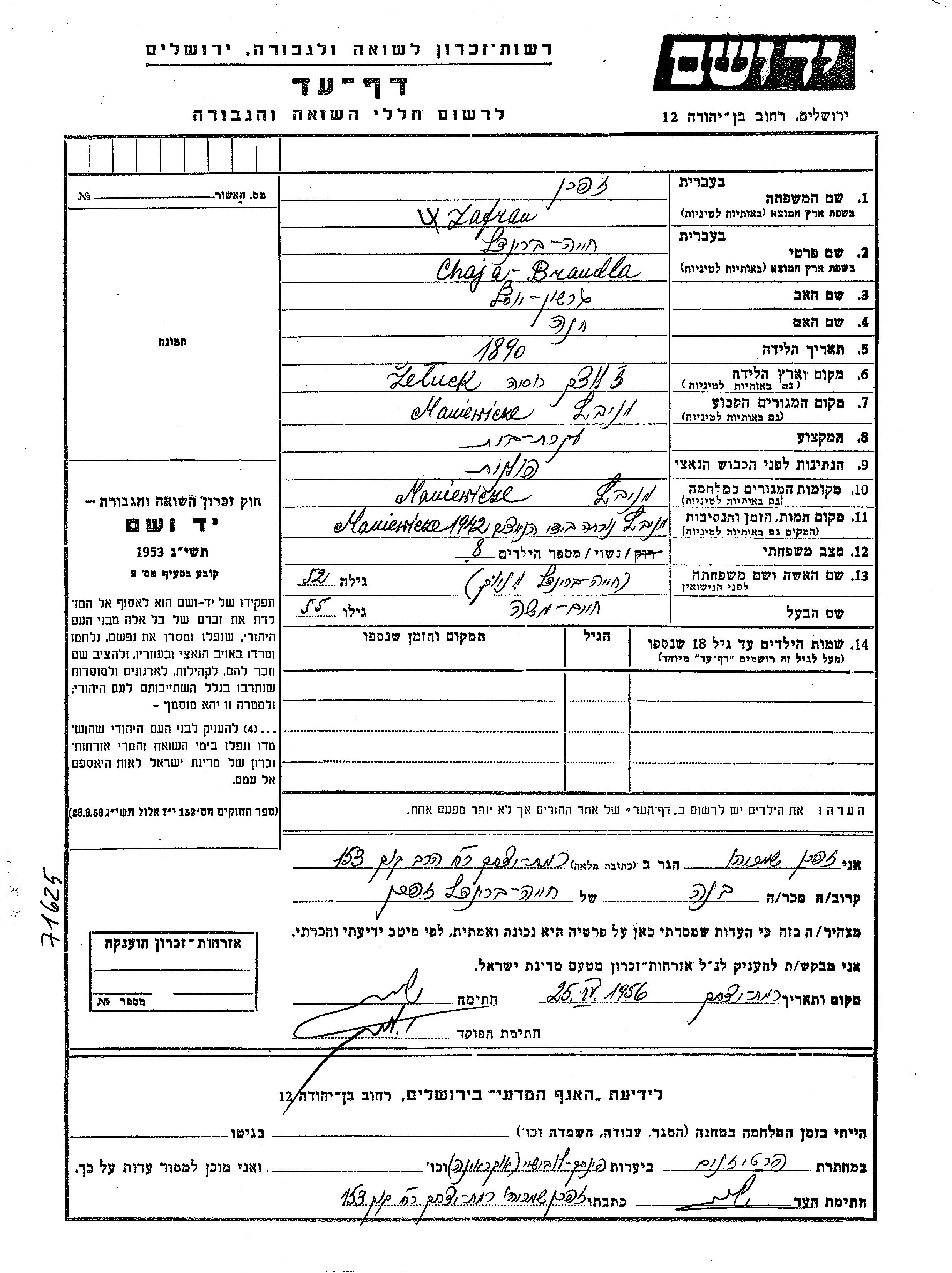 Хая Брандла Зафран, девичья фамилия Генюк, место рождения: Желуцк, Польша. Отец: Гершон Иосеф, mать:Хана. Домохозяйка. Женат / замужем. Место жительства до войны: Маневичи, Польша. Место во время войны: Маневичи, Польша.